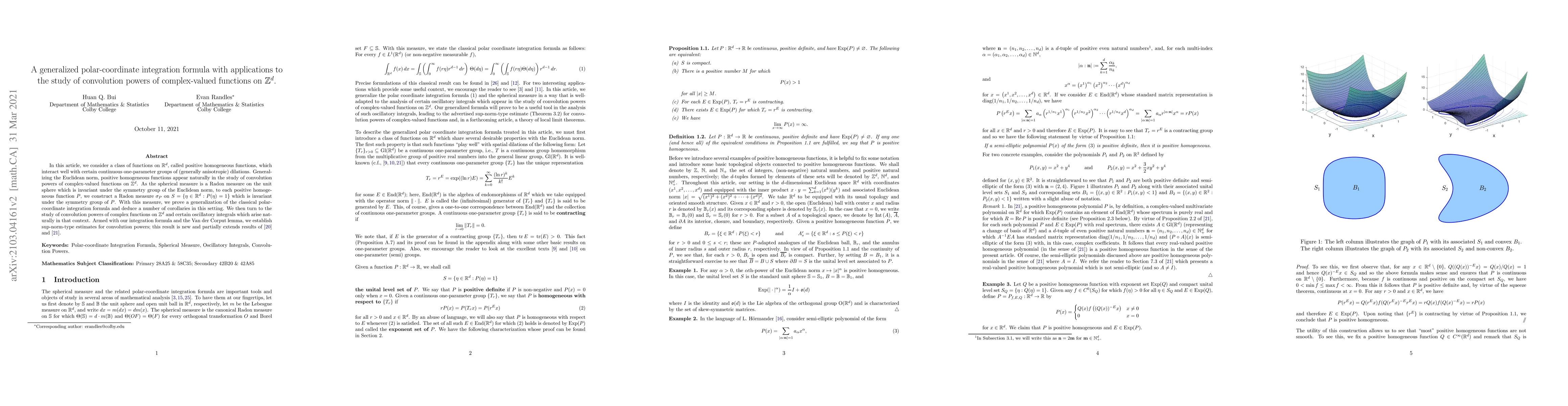 In this article, we consider a class of functions on $\mathbb{R}^d$, called positive homogeneous functions, which interact well with certain continuous one-parameter groups of (generally anisotropic) dilations. Generalizing the Euclidean norm, positive homogeneous functions appear naturally in the study of convolution powers of complex-valued functions on $\mathbb{Z}^d$. As the spherical measure is a Radon measure on the unit sphere which is invariant under the symmetry group of the Euclidean norm, to each positive homogeneous function $P$, we construct a Radon measure $\sigma_P$ on $S=\{\eta \in \mathbb{R}^d:P(\eta)=1\}$ which is invariant under the symmetry group of $P$. With this measure, we prove a generalization of the classical polar-coordinate integration formula and deduce a number of corollaries in this setting. We then turn to the study of convolution powers of complex functions on $\mathbb{Z}^d$ and certain oscillatory integrals which arise naturally in that context. Armed with our integration formula and the Van der Corput lemma, we establish sup norm-type estimates for convolution powers; this result is new and partially extends results of [20] and [21].