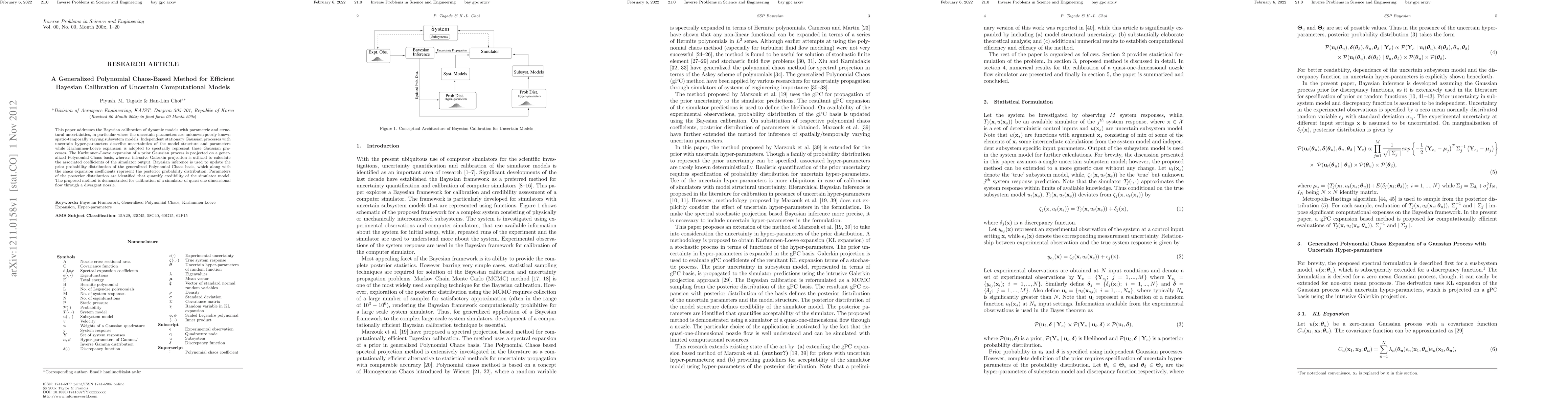 This paper proposes a generalized Polynomial Chaos-based method for Bayesian calibration of dynamic models with parametric and structural uncertainties. The method uses Karhunnen-Loeve expansion and intrusive Galerkin projection to efficiently update the prior probability distribution, demonstrating its application in calibrating a quasi-one-dimensional flow simulator.