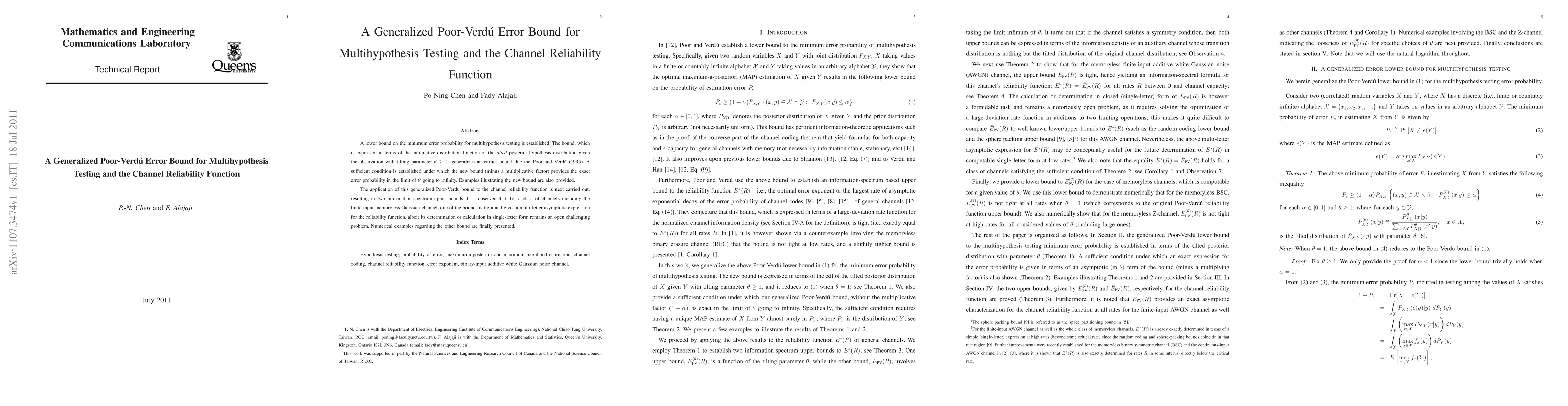 A lower bound on the minimum error probability for multihypothesis testing is established. The bound, which is expressed in terms of the cumulative distribution function of the tilted posterior hypothesis distribution given the observation with tilting parameter theta larger than or equal to 1, generalizes an earlier bound due the Poor and Verdu (1995). A sufficient condition is established under which the new bound (minus a multiplicative factor) provides the exact error probability in the limit of theta going to infinity. Examples illustrating the new bound are also provided. The application of this generalized Poor-Verdu bound to the channel reliability function is next carried out, resulting in two information-spectrum upper bounds. It is observed that, for a class of channels including the finite-input memoryless Gaussian channel, one of the bounds is tight and gives a multi-letter asymptotic expression for the reliability function, albeit its determination or calculation in single-letter form remains an open challenging problem. Numerical examples regarding the other bound are finally presented.
