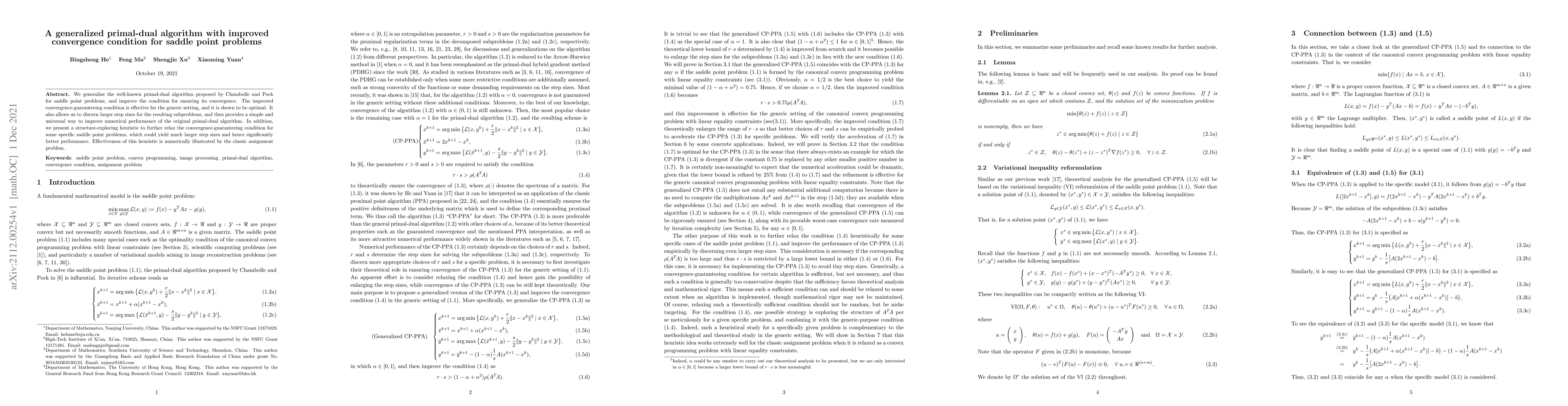This paper generalizes the primal-dual algorithm for saddle point problems, improving its convergence conditions and allowing for larger step sizes, thus enhancing numerical performance. A heuristic is also introduced to further relax conditions for specific problems, demonstrated through the assignment problem.