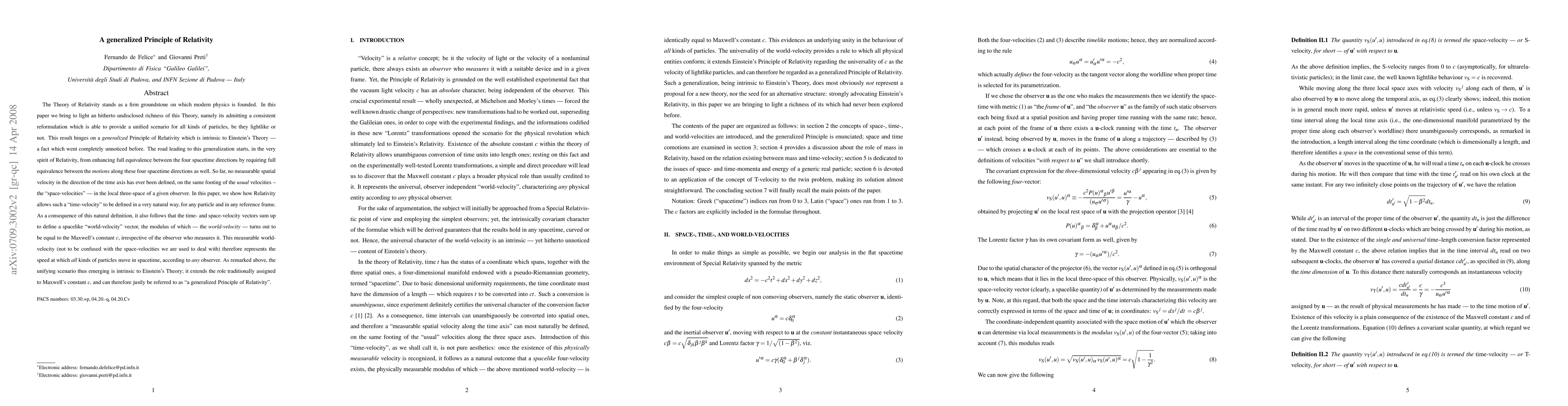 This paper proposes a generalized Principle of Relativity that unifies the treatment of all particles, including lightlike ones, by defining a measurable "time-velocity" in spacetime. This leads to a spacelike "world-velocity" vector with a constant modulus equal to Maxwell's constant c, representing the speed at which all particles move in spacetime.