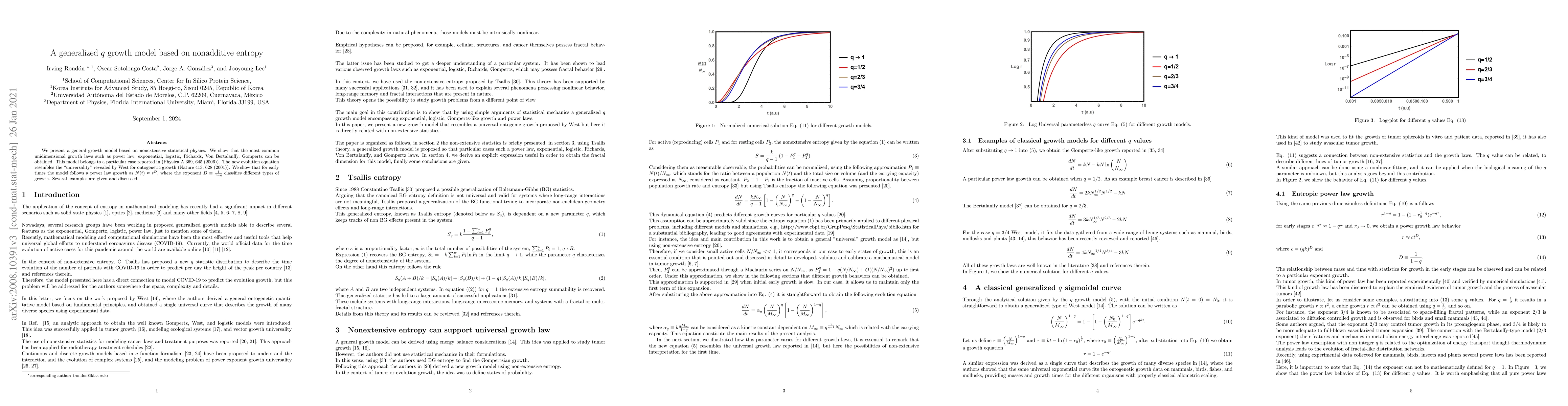 This paper introduces a generalized growth model based on non-extensive statistical physics using nonadditive $q$ entropy, showing it can derive various unidimensional growth laws. The model exhibits a power law growth for early times, classified by the exponent $D \equiv \frac{1}{1-q}$.