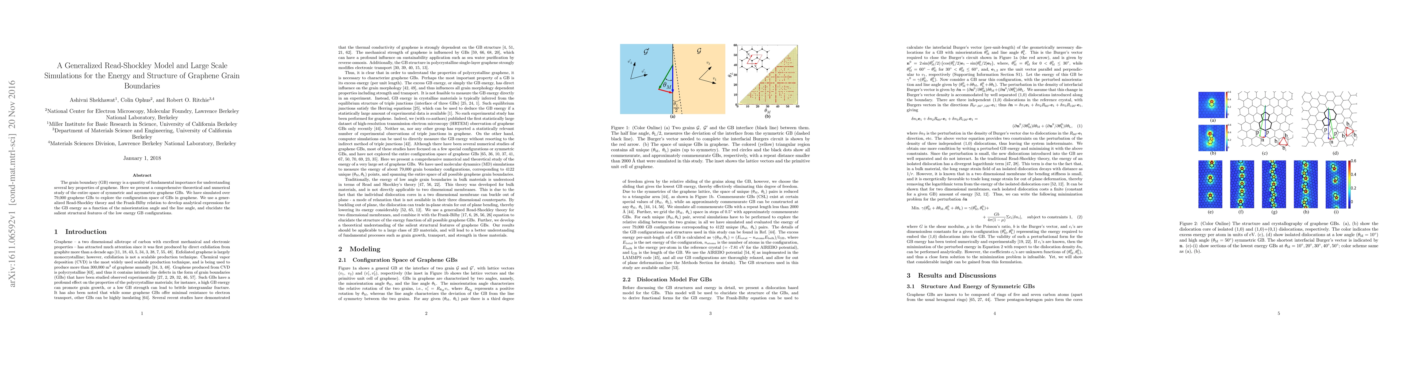 This paper presents a theoretical and numerical study of graphene grain boundaries (GBs), analyzing over 79,000 configurations to develop analytical expressions for GB energy based on misorientation and line angles using a generalized Read-Shockley model. The study elucidates the structural features of low energy GB configurations.