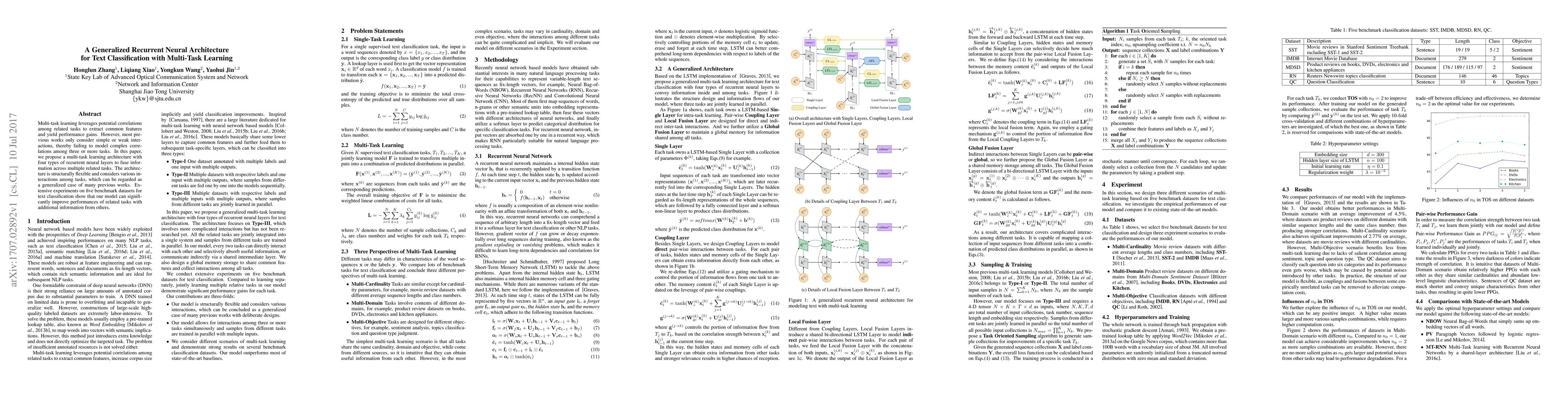 This paper proposes a generalized recurrent neural architecture for text classification using multi-task learning, featuring four types of recurrent layers to model complex correlations among multiple related tasks. Experiments demonstrate significant performance improvements across five benchmark datasets.