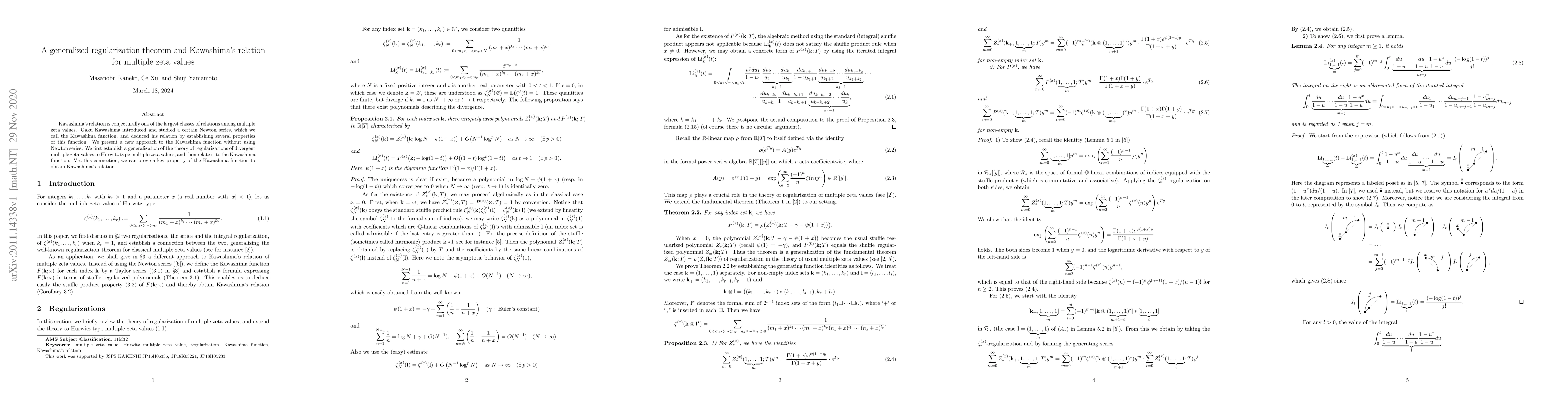 The paper generalizes regularization techniques for Hurwitz type multiple zeta values and connects this to a new approach for the Kawashima function, thereby proving Kawashima's conjectural relation without relying on Newton series.