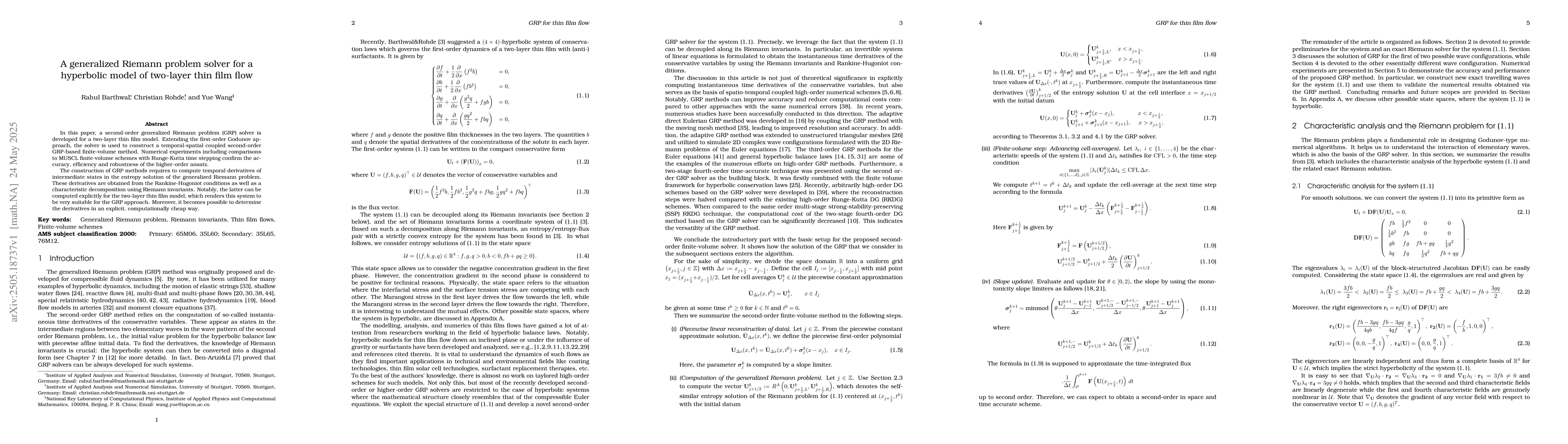 The research develops a second-order generalized Riemann problem (GRP) solver for a two-layer thin film model, extending the first-order Godunov approach to create a temporal-spatial coupled second-order GRP-based finite-volume method.