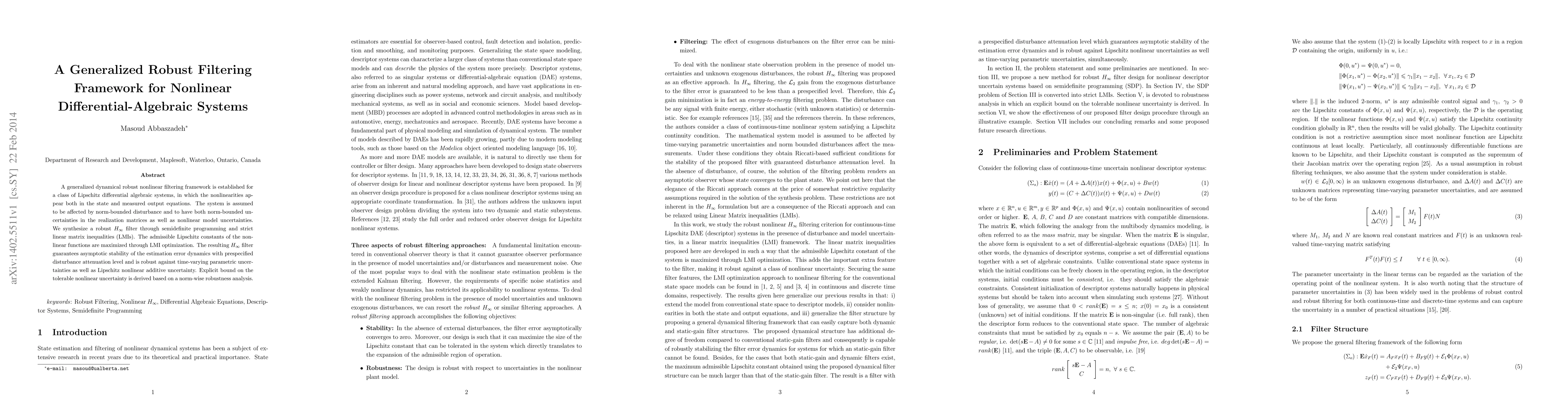 This paper proposes a generalized robust filtering framework for nonlinear differential-algebraic systems, synthesizing an H_infinity filter using semidefinite programming and LMIs to ensure stability and disturbance attenuation, while accommodating uncertainties and maximizing Lipschitz constants. The filter guarantees robust performance against time-varying uncertainties and nonlinearities.