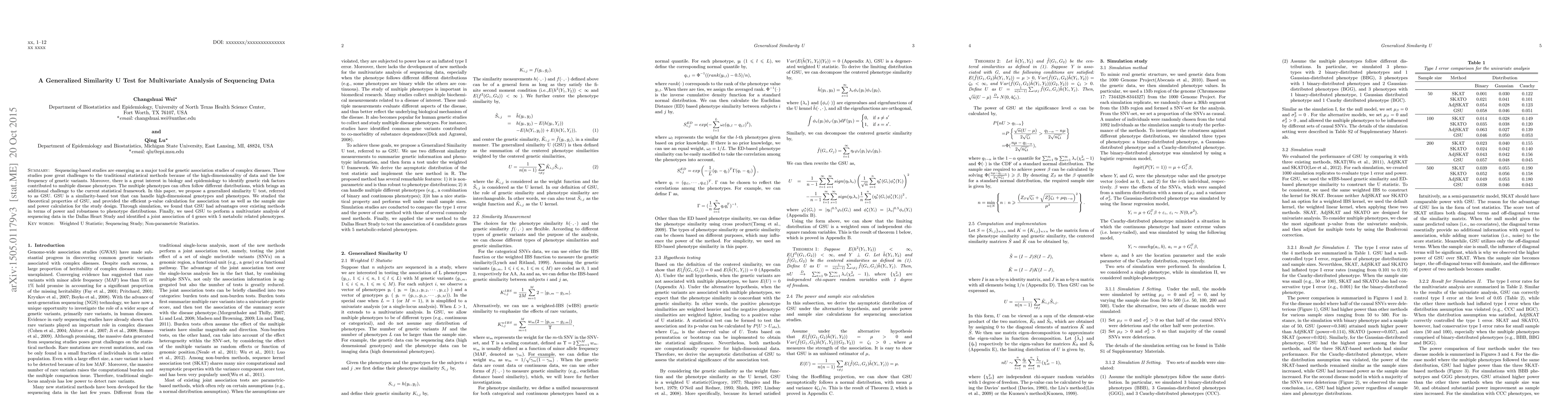 This paper proposes a generalized similarity U test (GSU) for multivariate analysis of high-dimensional sequencing data, demonstrating its advantages in power and robustness over existing methods through simulations and application in the Dallas Heart Study.