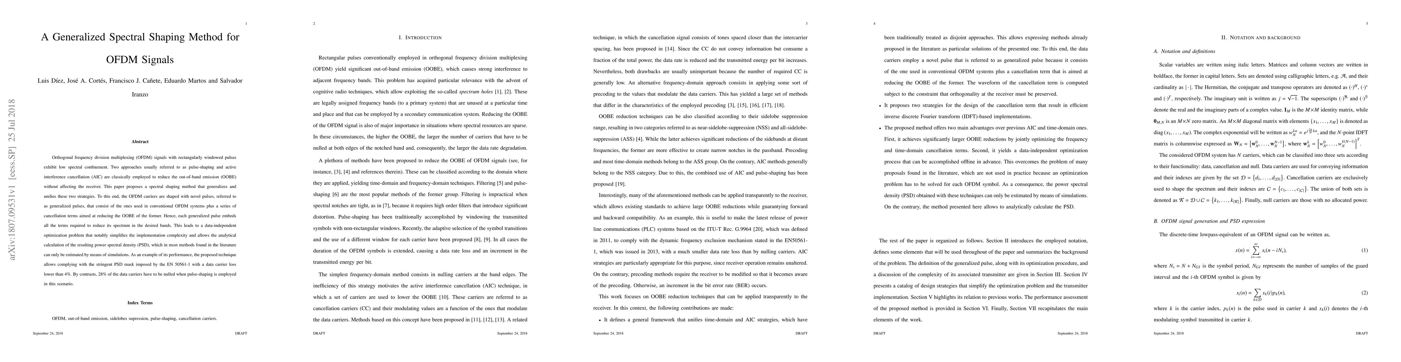 This paper introduces a generalized spectral shaping method for optimizing OFDM signals, combining pulse-shaping and active interference cancellation to reduce out-of-band emissions. The proposed method uses generalized pulses to simplify implementation and analytically calculate power spectral density, achieving better compliance with regulatory masks with minimal data loss.