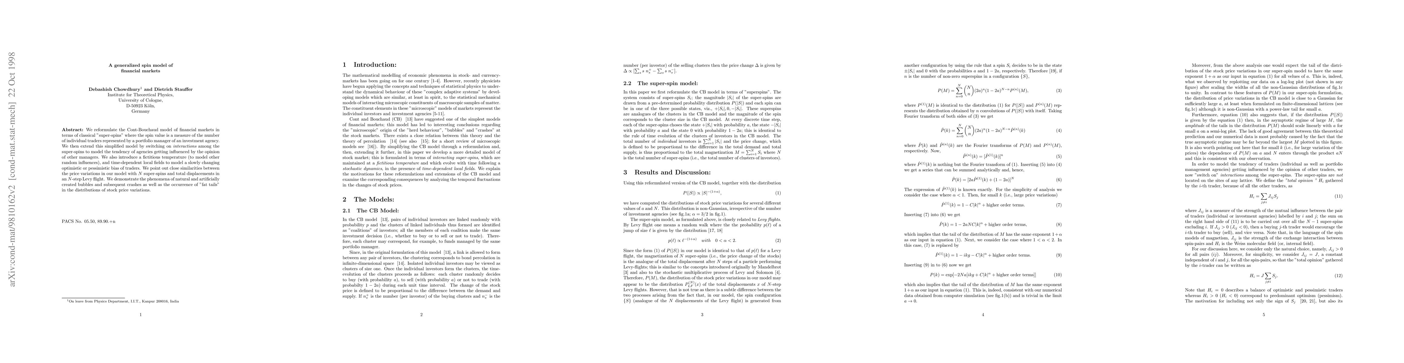 We reformulate the Cont-Bouchaud model of financial markets in terms of classical "super-spins" where the spin value is a measure of the number of individual traders represented by a portfolio manager of an investment agency. We then extend this simplified model by switching on interactions among the super-spins to model the tendency of agencies getting influenced by the opinion of other managers. We also introduce a fictitious temperature (to model other random influences), and time-dependent local fields to model slowly changing optimistic or pessimistic bias of traders. We point out close similarities between the price variations in our model with $N$ super-spins and total displacements in an $N$-step Levy flight. We demonstrate the phenomena of natural and artificially created bubbles and subsequent crashes as well as the occurrence of "fat tails" in the distributions of stock price variations.