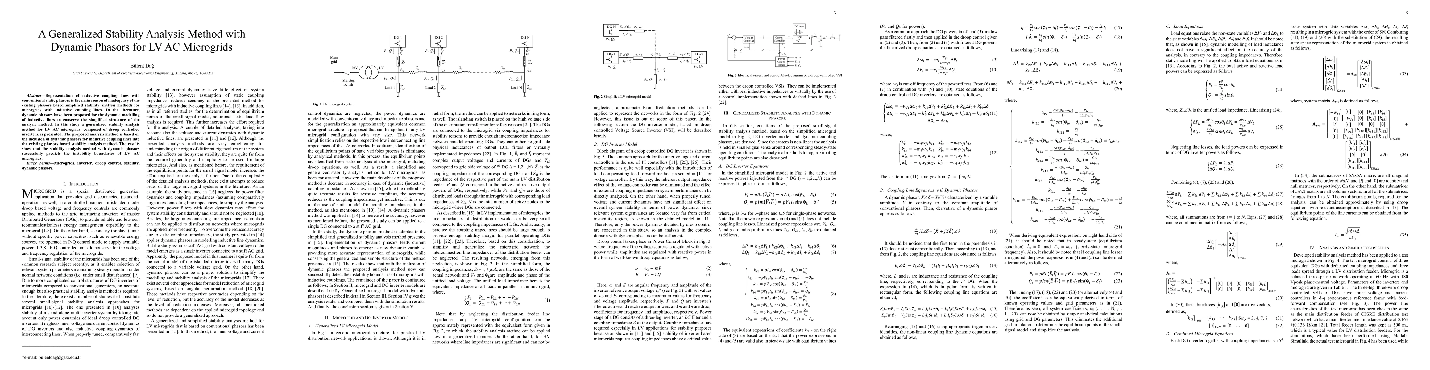 Representation of inductive coupling lines with conventional static phasors is the main reason of inadequacy of the existing phasors based simplified stability analysis methods for microgrids with inductive coupling lines. In the literature, dynamic phasors have been proposed for the dynamic modelling of inductive lines to conserve the simplified structure of the analysis method. In this study a generalized stability analysis method for LV AC microgrids, composed of droop controlled inverters, is presented. The proposed analysis method is based on the inclusion of dynamic phasors for inductive coupling lines into the existing phasors based stability analysis method. The results show that the stability analysis method with dynamic phasors successfully predicts the instability boundaries of LV AC microgrids.