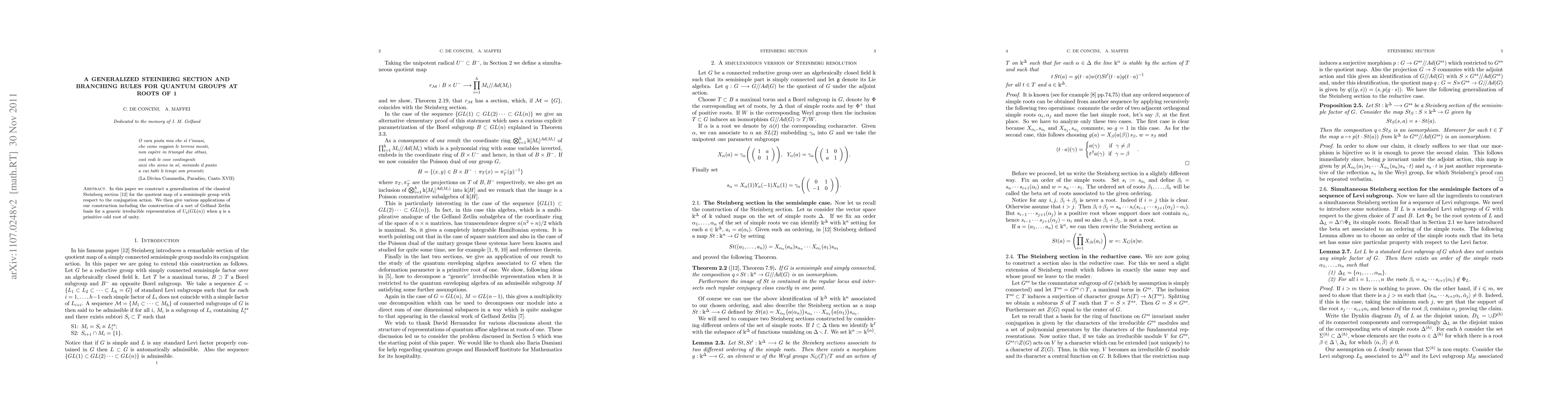 In this paper we construct a generalization of the classical Steinberg section for the quotient map of a semisimple group with respect to the conjugation action. We then give various applications of our construction including the construction of a sort of Gelfand Zetlin basis for a generic irreducible representation of quantum GL(n) at odd roots of unity.