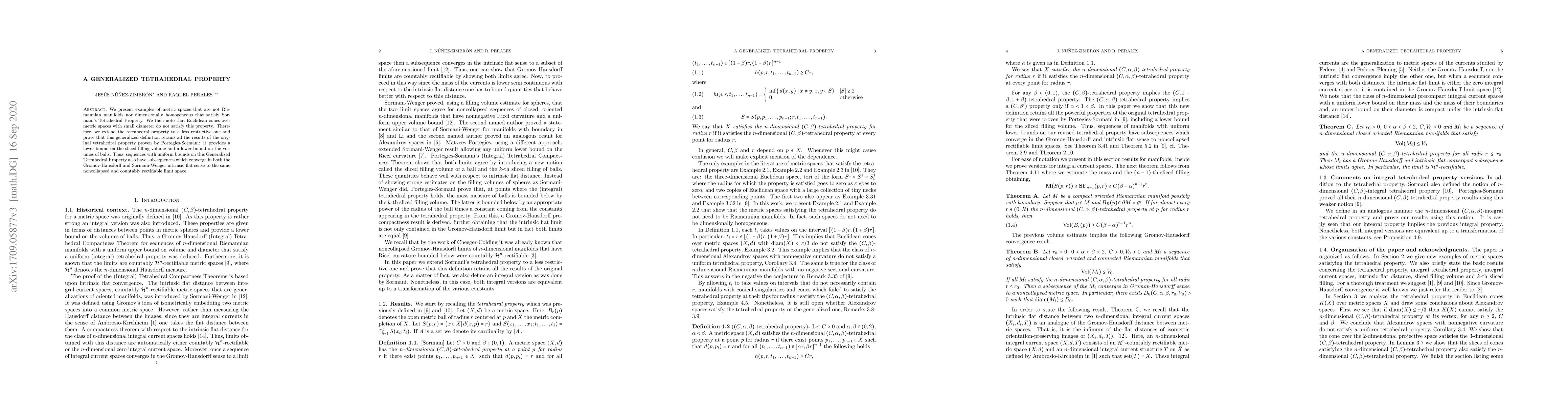 We present examples of metric spaces that are not Riemannian manifolds nor dimensionally homogeneous that satisfy the Tetrahedral Property. In spite of that, Euclidean cones over metric spaces with small diameter do not satisfy this property. We extend Sormani's Tetrahedral Property to a less restrictive property and prove that this generalized definition retains all the results of the original Tetrahedral Property proven by Portegies-Sormani: it provides a lower bound on the sliced filling volume and a lower bound on the volumes of balls. Thus sequences with uniform bounds on this Generalized Tetrahedral Property also have subsequences which converge in both the Gromov-Hausdorff and Sormani-Wenger Intrinsic Flat sense to the same non-collapsed and countably rectifiable limit space.
