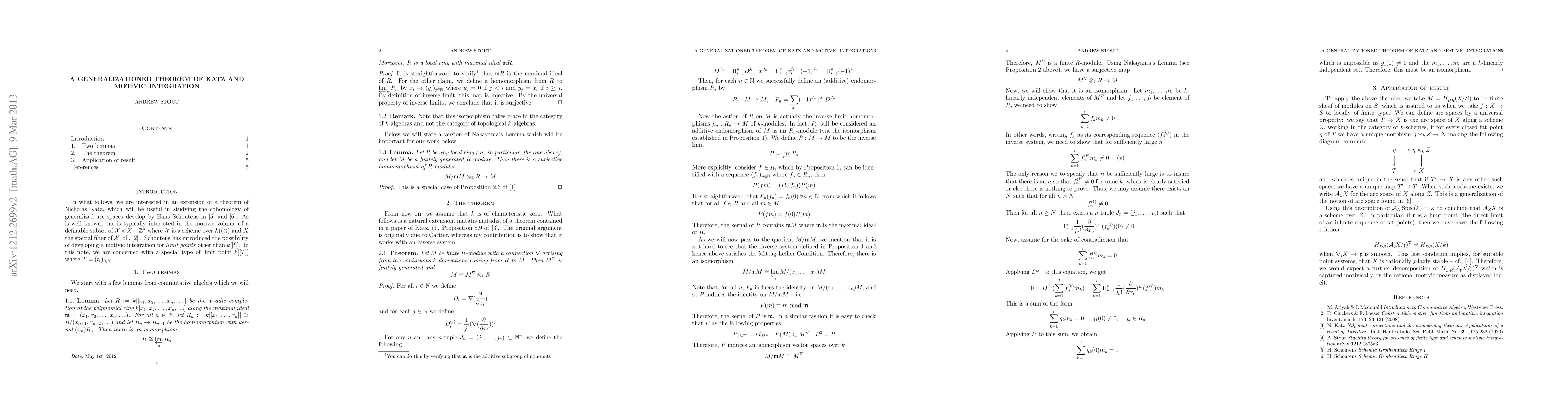 In what follows, we are interested in an extension of a theorem of Nicholas Katz, which will be useful in studying the cohomology of generalized arc spaces develop by Hans Schoutens. As is well known, one is typically interested in the motivic volume of a definable subset of $\mathcal{X} \times X \times \mathbb{Z}^n$ where $\mathcal{X}$ is a scheme over $k((t))$ and $X$ the special fiber of $\mathcal{X}$ . Schoutens has introduced the possibility of developing a motivic integration for limit points other than $k[[t]]$.