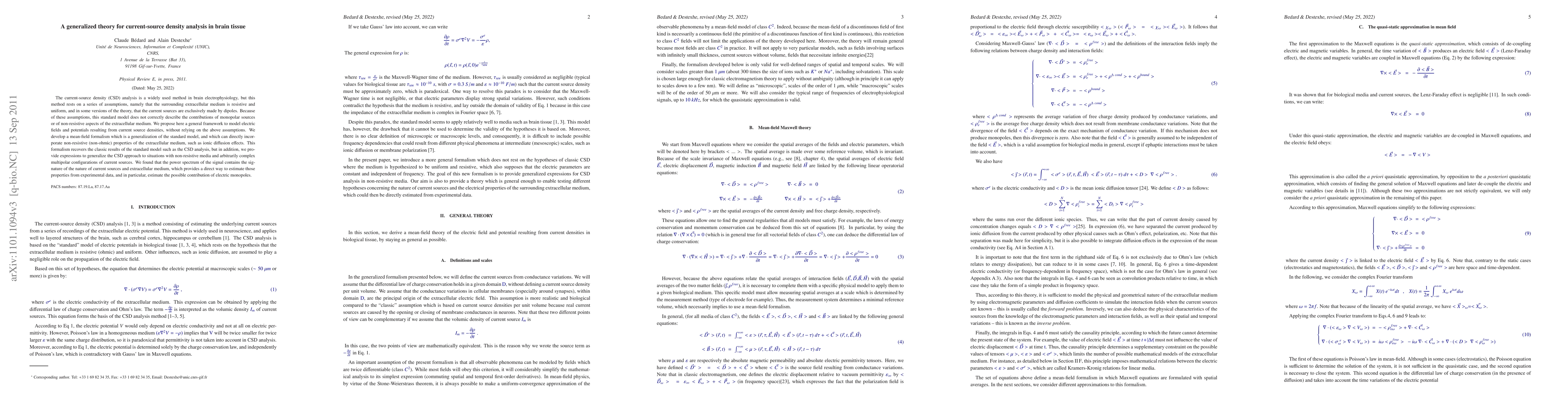 This paper proposes a generalized theory for current-source density (CSD) analysis in brain tissue, moving beyond the standard resistive and uniform medium assumptions. It introduces a mean-field formalism that incorporates non-resistive properties and complex multipolar current sources, enabling more accurate modeling of extracellular medium effects and estimation of current source contributions from experimental data.