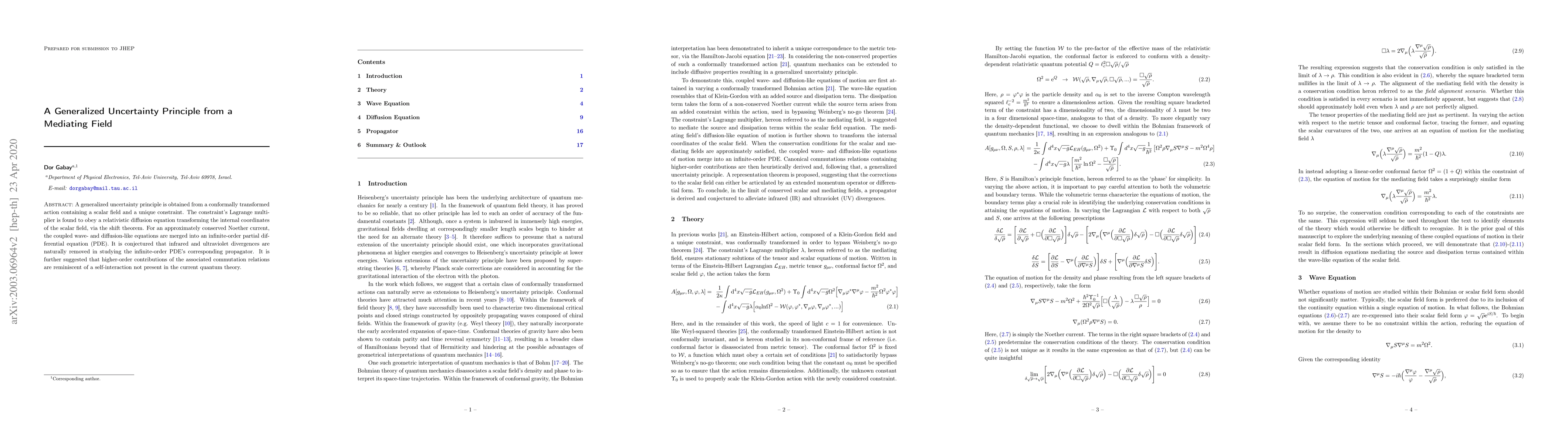 A generalized uncertainty principle is obtained from a conformally transformed action containing a scalar field and a unique constraint. The constraint's Lagrange multiplier is found to obey a relativistic diffusion equation transforming the internal coordinates of the scalar field, via the shift theorem. For an approximately conserved Noether current, the coupled wave- and diffusion-like equations are merged into an infinite-order partial differential equation (PDE). It is conjectured that infrared and ultraviolet divergences are naturally removed in studying the infinite-order PDE's corresponding propagator. It is further suggested that higher-order contributions of the associated commutation relations are reminiscent of a self-interaction not present in the current quantum theory.