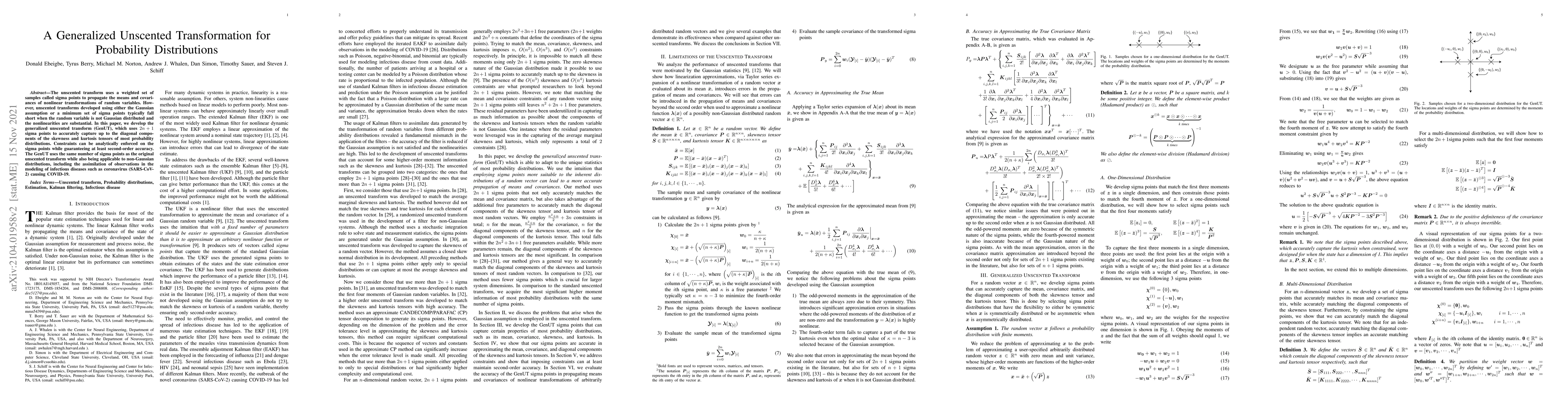 The unscented transform uses a weighted set of samples called sigma points to propagate the means and covariances of nonlinear transformations of random variables. However, unscented transforms developed using either the Gaussian assumption or a minimum set of sigma points typically fall short when the random variable is not Gaussian distributed and the nonlinearities are substantial. In this paper, we develop the generalized unscented transform (GenUT), which uses 2n+1 sigma points to accurately capture up to the diagonal components of the skewness and kurtosis tensors of most probability distributions. Constraints can be analytically enforced on the sigma points while guaranteeing at least second-order accuracy. The GenUT uses the same number of sigma points as the original unscented transform while also being applicable to non-Gaussian distributions, including the assimilation of observations in the modeling of infectious diseases such as coronavirus (SARS-CoV-2) causing COVID-19.