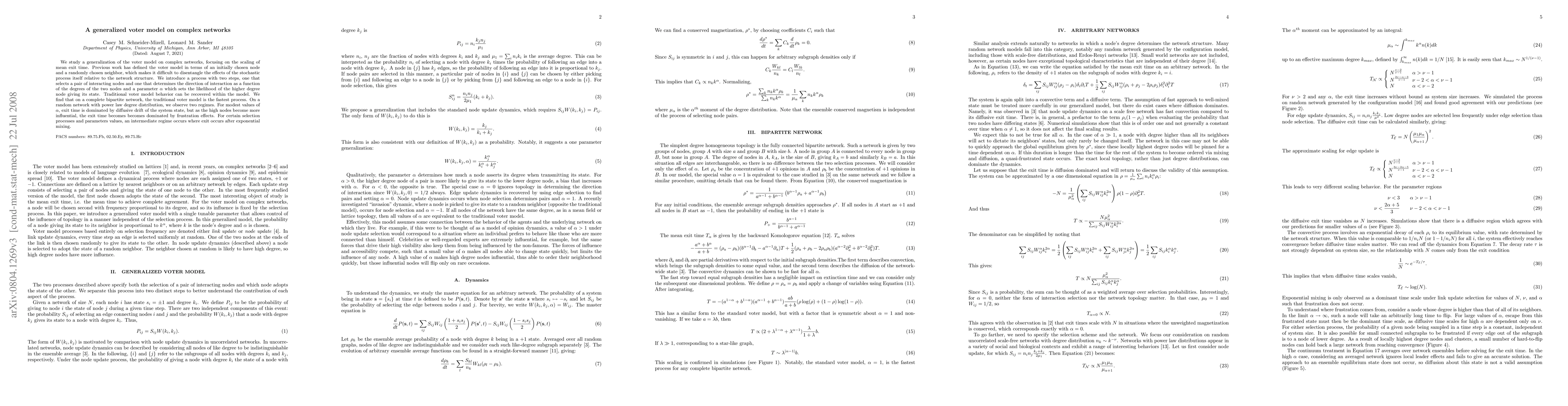 This paper generalizes the voter model on complex networks, introducing a two-step process to better isolate the effects of network structure. It finds that on complete bipartite networks, traditional voter model behavior is fastest, while on random networks with power law degree distributions, exit time shifts from diffusive drift to frustration effects as the influence of higher-degree nodes increases.
