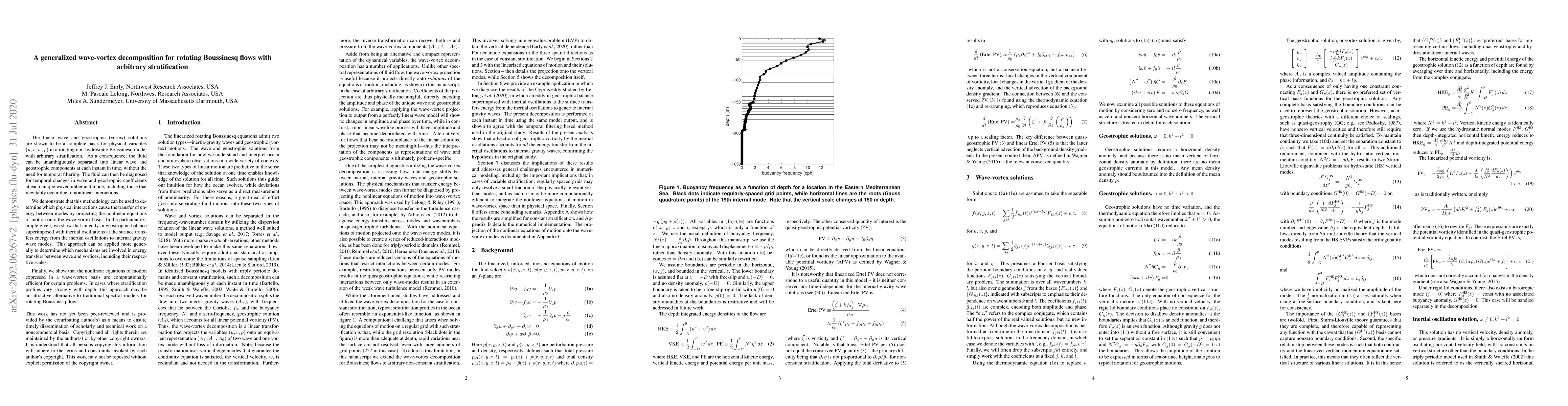 The linear wave and geostrophic (vortex) solutions are shown to be a complete basis for physical variables $(u,v,w,\rho)$ in a rotating non-hydrostatic Boussinesq model with arbitrary stratification. As a consequence, the fluid can be unambiguously separated into linear wave and geostrophic components at each instant in time, without the need for temporal filtering. The fluid can then be diagnosed for temporal changes in wave and geostrophic coefficients at each unique wavenumber and mode, including those that inevitably occur due to nonlinear interactions. We demonstrate that this methodology can be used to determine which physical interactions cause the transfer of energy between modes by projecting the nonlinear equations of motion onto the wave-vortex basis. In the particular example given, we show that an eddy in geostrophic balance superimposed with inertial oscillations at the surface transfers energy from the inertial oscillations to internal gravity wave modes. This approach can be applied more generally to determine which mechanisms are involved in energy transfers between wave and vortices, including their respective scales. Finally, we show that the nonlinear equations of motion expressed in a wave-vortex basis are computationally efficient for certain problems. In cases where stratification profiles vary strongly with depth, this approach may be an attractive alternative to traditional spectral models for rotating Boussinesq flow.