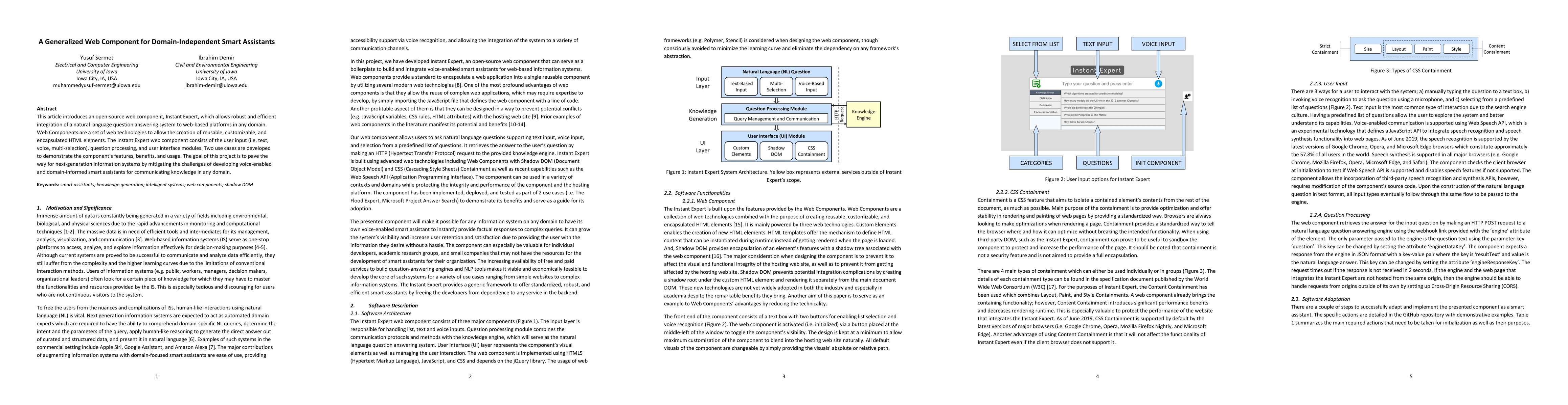 This paper presents Instant Expert, an open-source web component for integrating natural language question-answering systems into web platforms across various domains. The component aims to simplify the development of voice-enabled smart assistants by providing reusable modules for user input, question processing, and user interfaces.