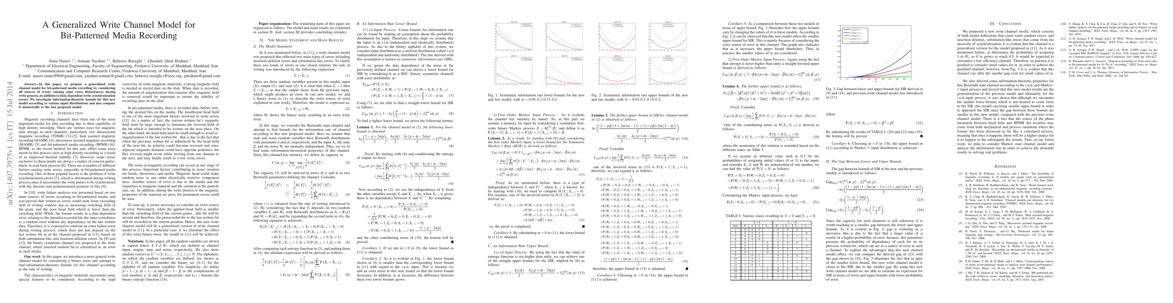 In this paper, we propose a generalized write channel model for bit-patterned media recording by considering all sources of errors causing some extra disturbances during write process, in addition to data dependent write synchronization errors. We investigate information-theoretic bounds for this new model according to various input distributions and also compare it numerically to the last proposed model.