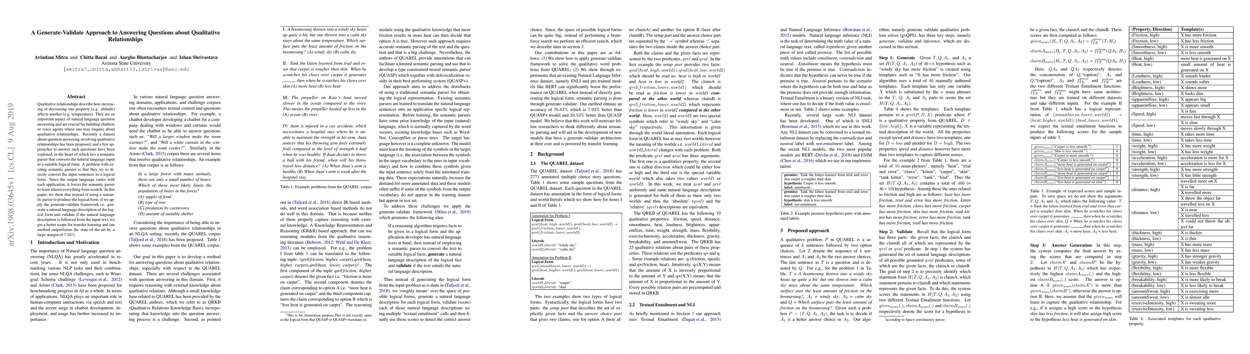 This paper proposes a generate-validate approach for answering questions about qualitative relationships, outperforming existing methods by 7.93%. Instead of directly converting natural language to logical forms, it generates a natural language description and validates it against the input, enhancing transfer learning.