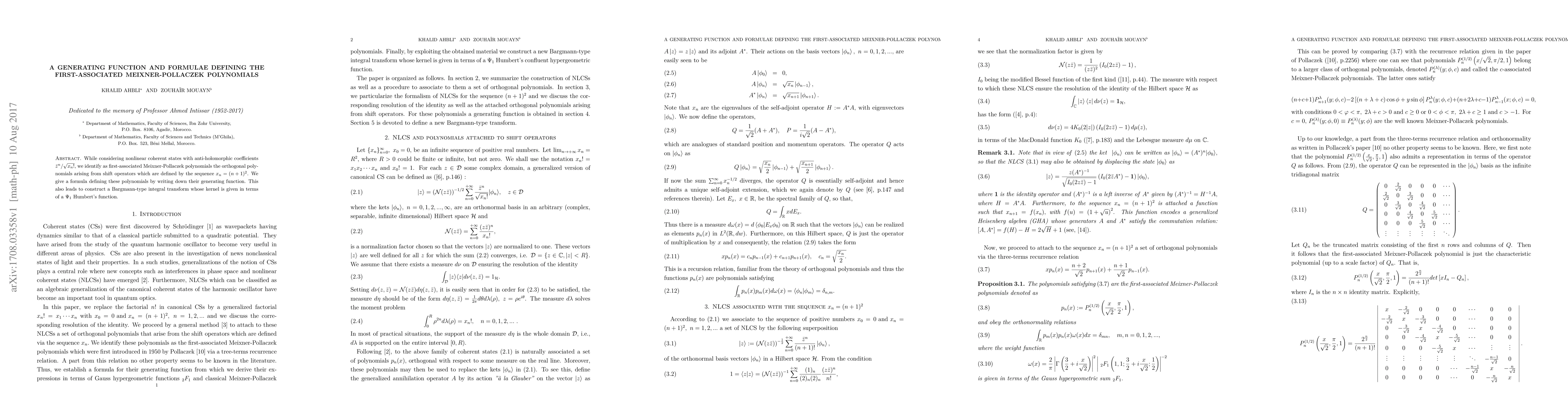 While considering nonlinear coherent states with specific anti-holomorphic coefficients $\bar{z}^n/\sqrt{x_n!}$, we identify as first associated Meixner-Pollaczek polynomials the orthogonal polynomials arising from shift operators which are defined by the sequence $x_n=(n+1)^2$ . We give a formula defining these polynomials by writing down their generating function. This also leads to construct a Bargmann-type integral transform whose kernel is given in terms of a $\Psi_1$ Humbert's function.