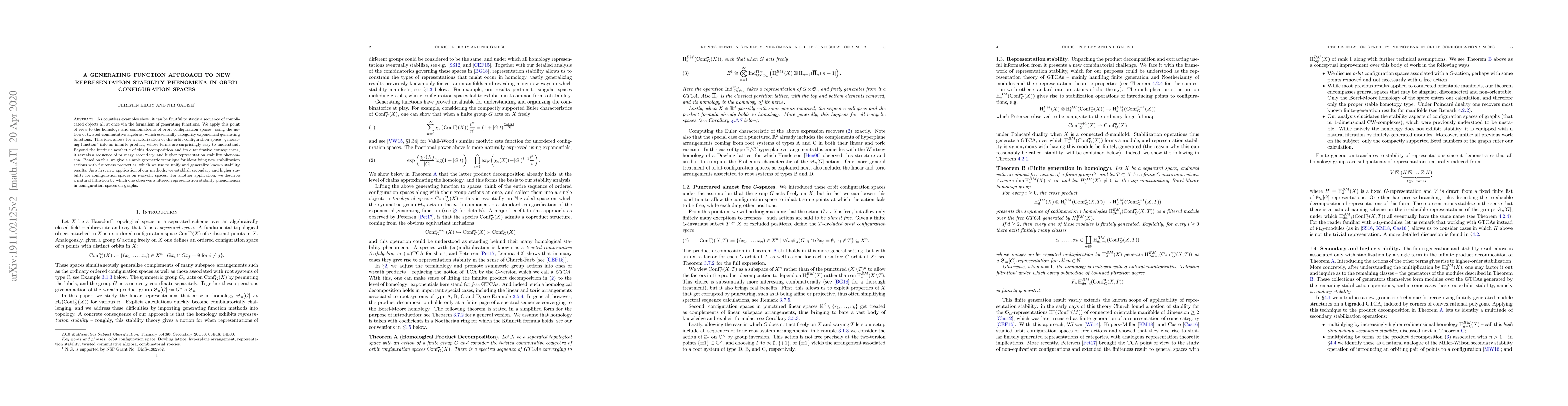 As countless examples show, it can be fruitful to study a sequence of complicated objects all at once via the formalism of generating functions. We apply this point of view to the homology and combinatorics of orbit configuration spaces: using the notion of twisted commutative algebras, which essentially categorify exponential generating functions. This idea allows for a factorization of the orbit configuration space "generating function" into an infinite product, whose terms are surprisingly easy to understand. Beyond the intrinsic aesthetic of this decomposition and its quantitative consequences, it reveals a sequence of primary, secondary, and higher representation stability phenomena. Based on this, we give a simple geometric technique for identifying new stabilization actions with finiteness properties, which we use to unify and generalize known stability results. As a first new application of our methods, we establish secondary and higher stability for configuration spaces on $i$-acyclic spaces. For another application, we describe a natural filtration by which one observes a filtered representation stability phenomenon in configuration spaces on graphs.