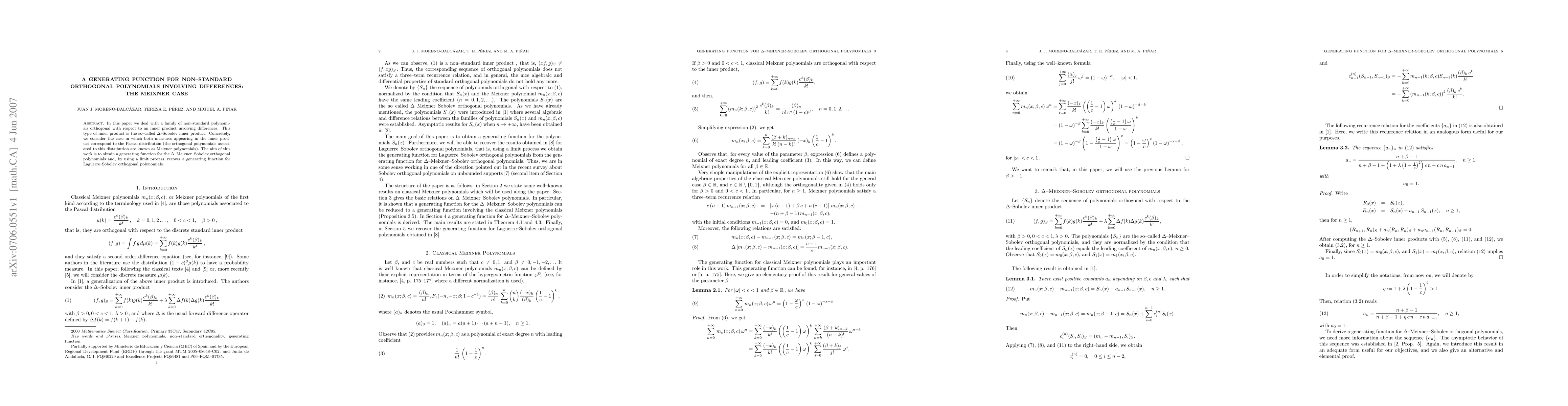 In this paper we deal with a family of non--standard polynomials orthogonal with respect to an inner product involving differences. This type of inner product is the so--called $\Delta$--Sobolev inner product. Concretely, we consider the case in which both measures appearing in the inner product correspond to the Pascal distribution (the orthogonal polynomials associated to this distribution are known as Meixner polynomials). The aim of this work is to obtain a generating function for the $\Delta$--Meixner--Sobolev orthogonal polynomials and, by using a limit process, recover a generating function for Laguerre--Sobolev orthogonal polynomials.