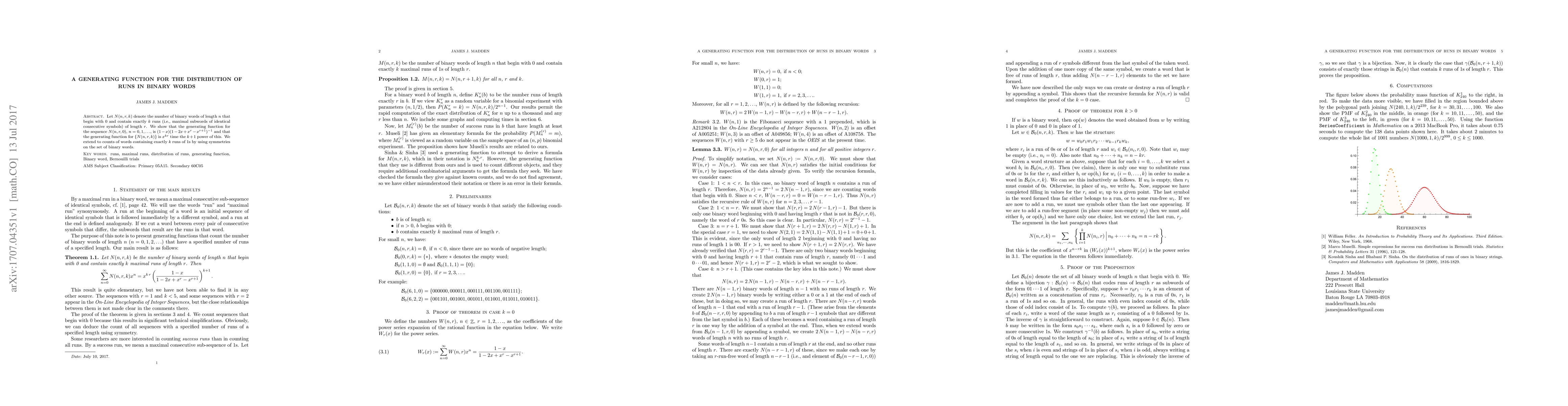 Let $N(n,r,k)$ denote the number of binary words of length $n$ that begin with $0$ and contain exactly $k$ runs (i.e., maximal subwords of identical consecutive symbols) of length $r$. We show that the generating function for the sequence $N(n,r,0)$, $n=0,1,\ldots$, is $(1-x)(1-2x + x^r-x^{r+1})^{-1}$ and that the generating function for $\{N(n,r,k)\}$ is $x^{kr}$ time the $k+1$ power of this. We extend to counts of words containing exactly $k$ runs of $1$s by using symmetries on the set of binary words.