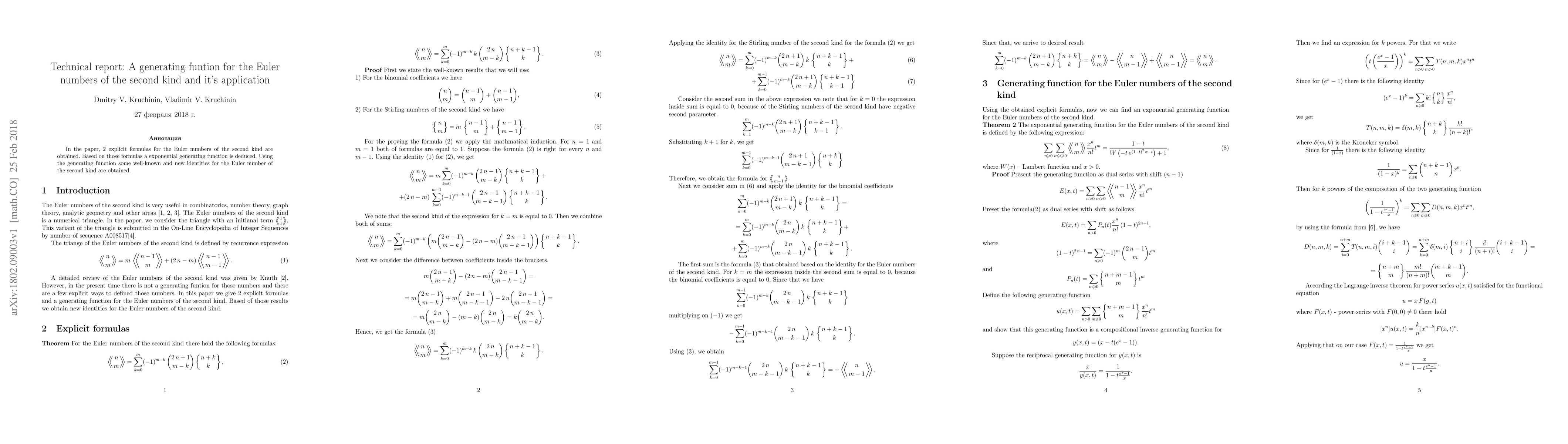 In the paper, 2 explicit formulas for the Euler numbers of the second kind are obtained. Based on those formulas a exponential generating function is deduced. Using the generating function some well-known and new identities for the Euler number of the second kind are obtained.