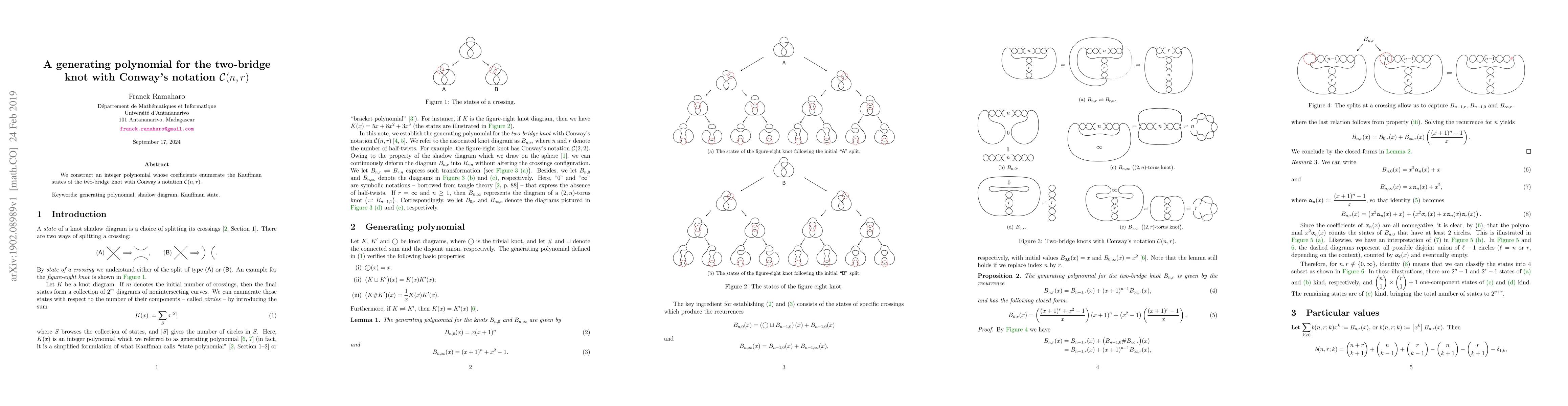 Summary: This paper constructs an integer polynomial that enumerates the Kauffman states of the two-bridge knot represented by Conway's notation C(n,r), providing a mathematical framework for understanding its structure.
