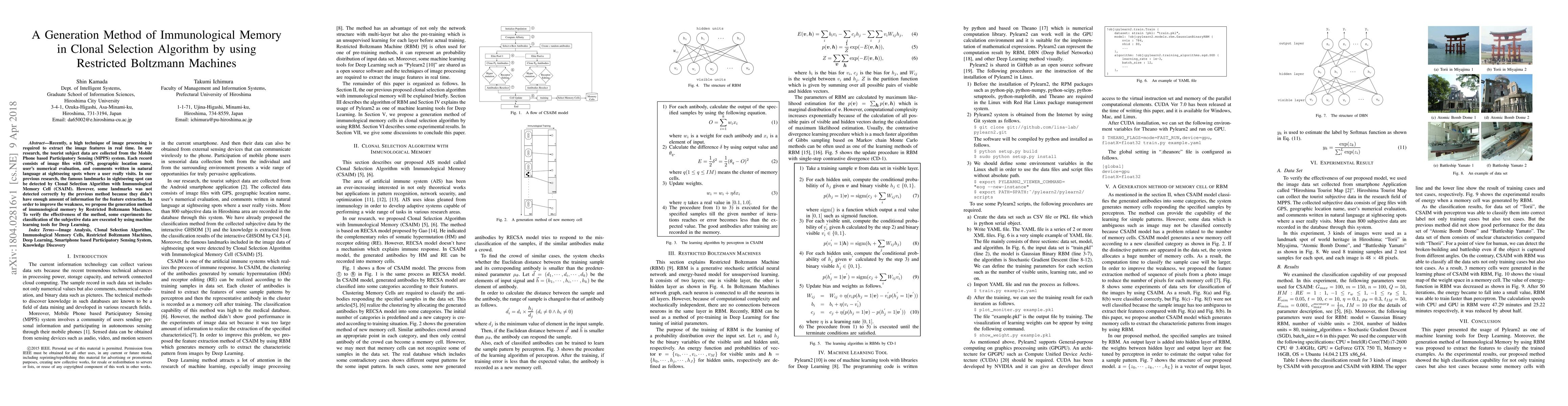 Recently, a high technique of image processing is required to extract the image features in real time. In our research, the tourist subject data are collected from the Mobile Phone based Participatory Sensing (MPPS) system. Each record consists of image files with GPS, geographic location name, user's numerical evaluation, and comments written in natural language at sightseeing spots where a user really visits. In our previous research, the famous landmarks in sightseeing spot can be detected by Clonal Selection Algorithm with Immunological Memory Cell (CSAIM). However, some landmarks was not detected correctly by the previous method because they didn't have enough amount of information for the feature extraction. In order to improve the weakness, we propose the generation method of immunological memory by Restricted Boltzmann Machines. To verify the effectiveness of the method, some experiments for classification of the subjective data are executed by using machine learning tools for Deep Learning.