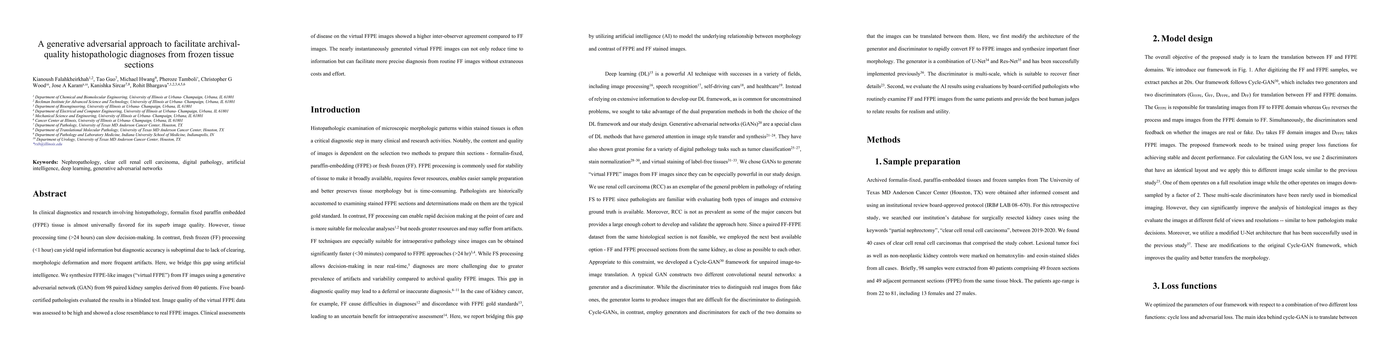 In clinical diagnostics and research involving histopathology, formalin fixed paraffin embedded (FFPE) tissue is almost universally favored for its superb image quality. However, tissue processing time (more than 24 hours) can slow decision-making. In contrast, fresh frozen (FF) processing (less than 1 hour) can yield rapid information but diagnostic accuracy is suboptimal due to lack of clearing, morphologic deformation and more frequent artifacts. Here, we bridge this gap using artificial intelligence. We synthesize FFPE-like images ,virtual FFPE, from FF images using a generative adversarial network (GAN) from 98 paired kidney samples derived from 40 patients. Five board-certified pathologists evaluated the results in a blinded test. Image quality of the virtual FFPE data was assessed to be high and showed a close resemblance to real FFPE images. Clinical assessments of disease on the virtual FFPE images showed a higher inter-observer agreement compared to FF images. The nearly instantaneously generated virtual FFPE images can not only reduce time to information but can facilitate more precise diagnosis from routine FF images without extraneous costs and effort.