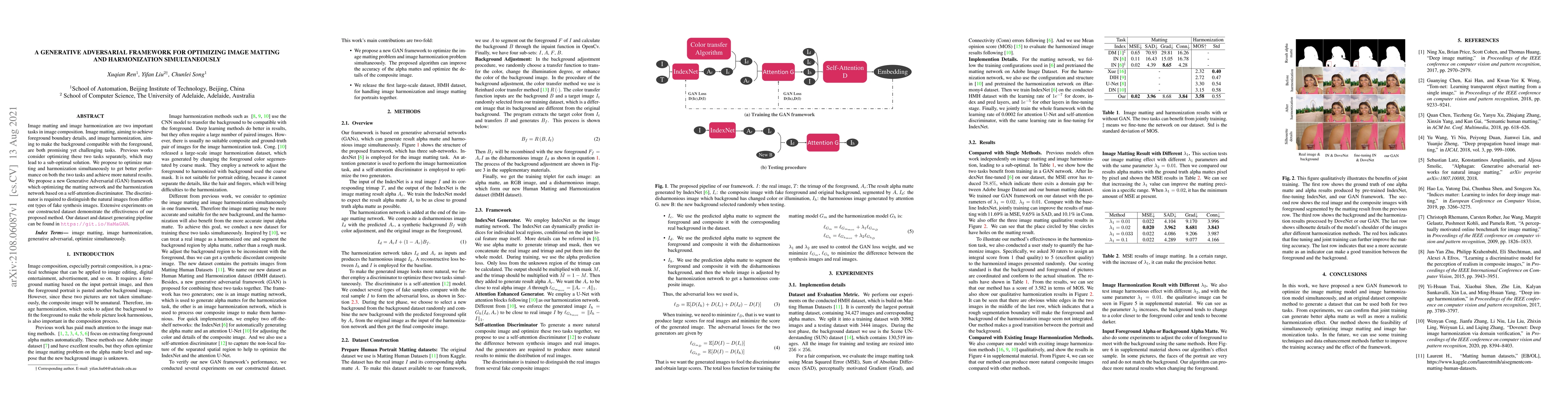 This paper proposes a Generative Adversarial Framework to optimize image matting and harmonization simultaneously, achieving better performance and more natural results compared to separate optimization. The framework uses a self-attention discriminator to distinguish natural images from synthesized fakes, and experiments show its effectiveness.