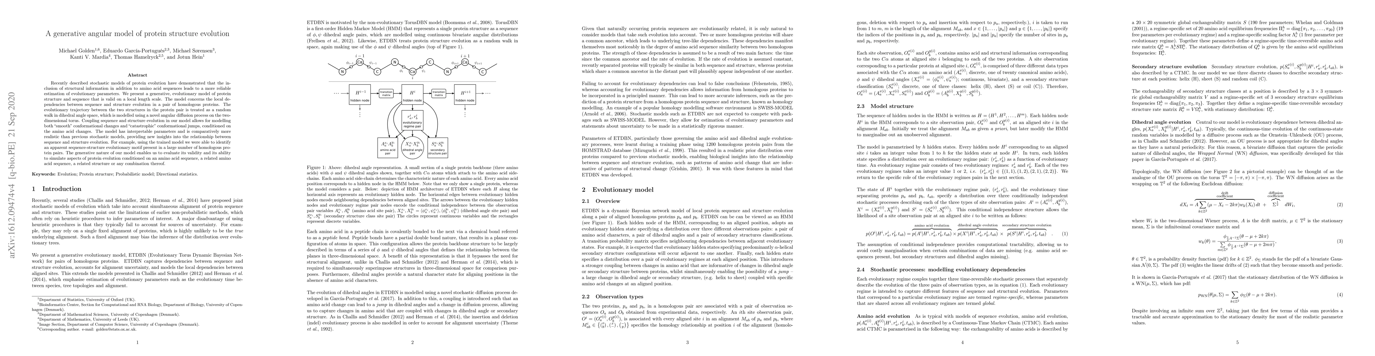 This paper introduces a generative model for protein structure evolution that integrates structural and sequence information, employing an angular diffusion process to model conformational changes. The model captures both gradual and abrupt structural shifts, offering insights into sequence-structure evolutionary relationships and enabling simulations of protein evolution.