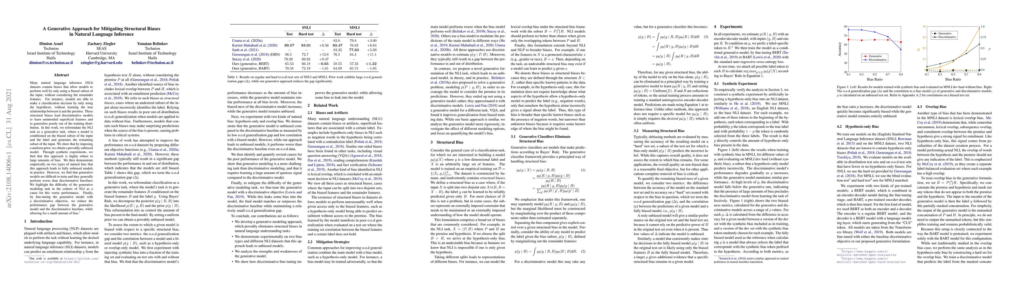 This paper proposes a generative approach to mitigate structural biases in natural language inference (NLI) by reformulating the task to generate the unbiased subset of input data conditioned on the biased subset and label. While this method leads to unbiased models, it struggles with training and generally performs worse than discriminative baselines, though fine-tuning with a discriminative objective helps bridge the performance gap.