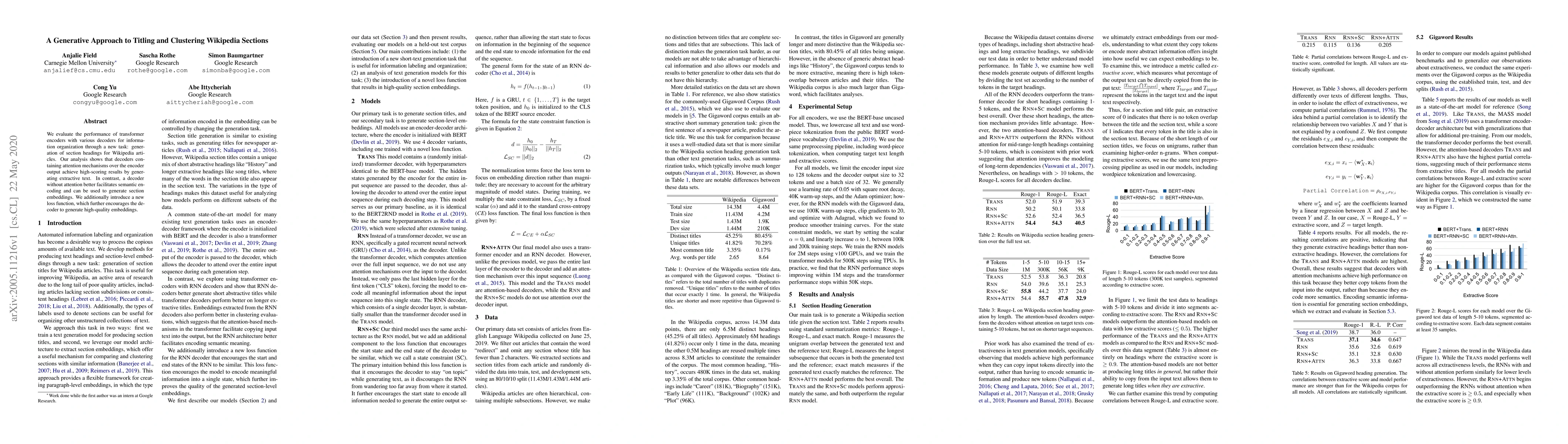The paper evaluates transformer encoders with various decoders for generating Wikipedia section headings, using a new loss function and comparing performance with the Gigaword corpus.