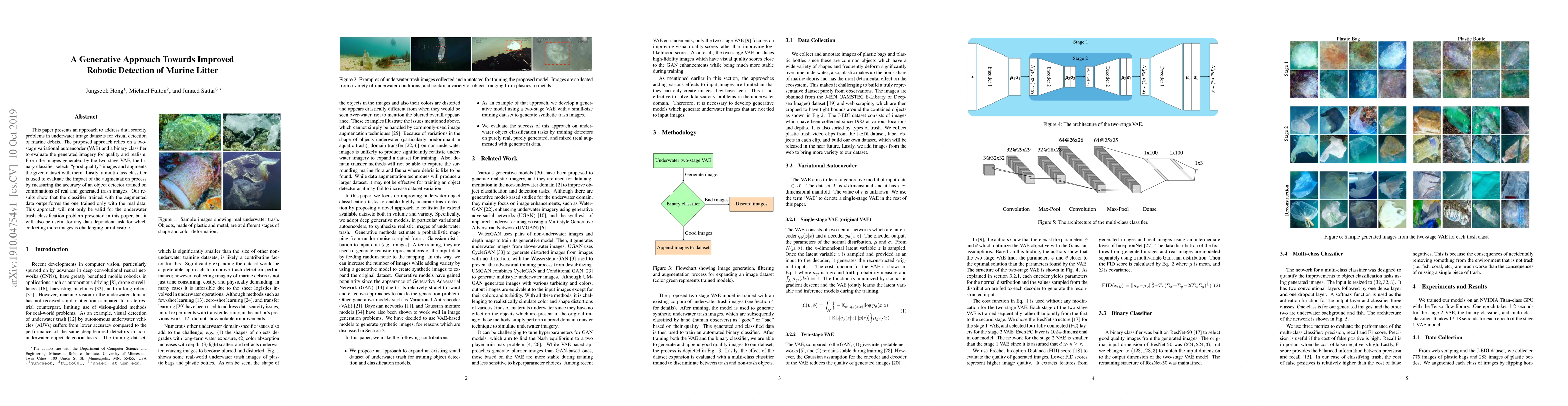 This paper presents an approach to address data scarcity problems in underwater image datasets for visual detection of marine debris. The proposed approach relies on a two-stage variational autoencoder (VAE) and a binary classifier to evaluate the generated imagery for quality and realism. From the images generated by the two-stage VAE, the binary classifier selects "good quality" images and augments the given dataset with them. Lastly, a multi-class classifier is used to evaluate the impact of the augmentation process by measuring the accuracy of an object detector trained on combinations of real and generated trash images. Our results show that the classifier trained with the augmented data outperforms the one trained only with the real data. This approach will not only be valid for the underwater trash classification problem presented in this paper, but it will also be useful for any data-dependent task for which collecting more images is challenging or infeasible.