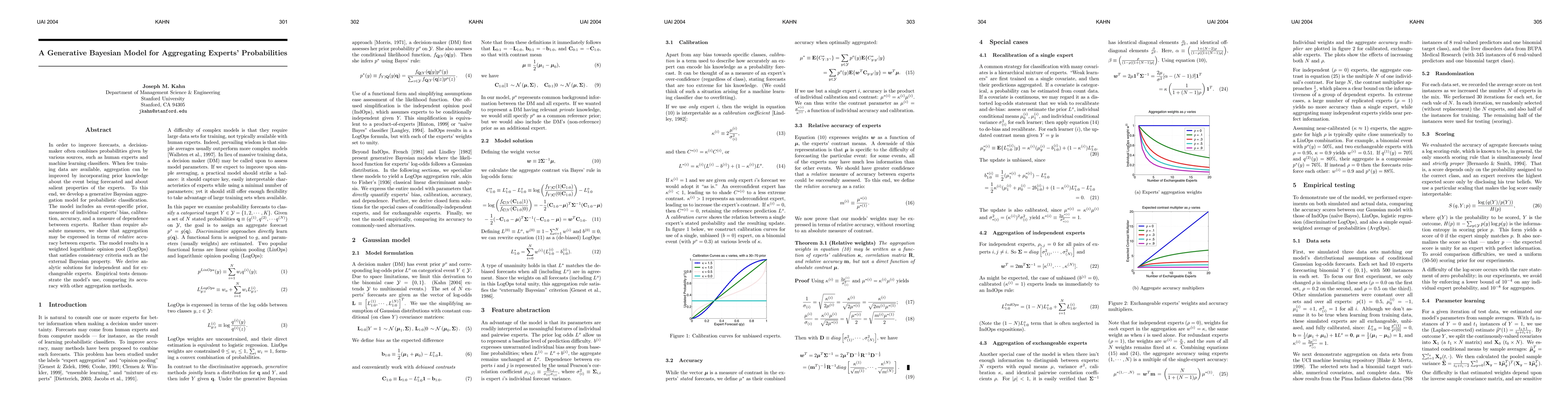 In order to improve forecasts, a decisionmaker often combines probabilities given by various sources, such as human experts and machine learning classifiers. When few training data are available, aggregation can be improved by incorporating prior knowledge about the event being forecasted and about salient properties of the experts. To this end, we develop a generative Bayesian aggregation model for probabilistic classi cation. The model includes an event-specific prior, measures of individual experts' bias, calibration, accuracy, and a measure of dependence betweeen experts. Rather than require absolute measures, we show that aggregation may be expressed in terms of relative accuracy between experts. The model results in a weighted logarithmic opinion pool (LogOps) that satis es consistency criteria such as the external Bayesian property. We derive analytic solutions for independent and for exchangeable experts. Empirical tests demonstrate the model's use, comparing its accuracy with other aggregation methods.