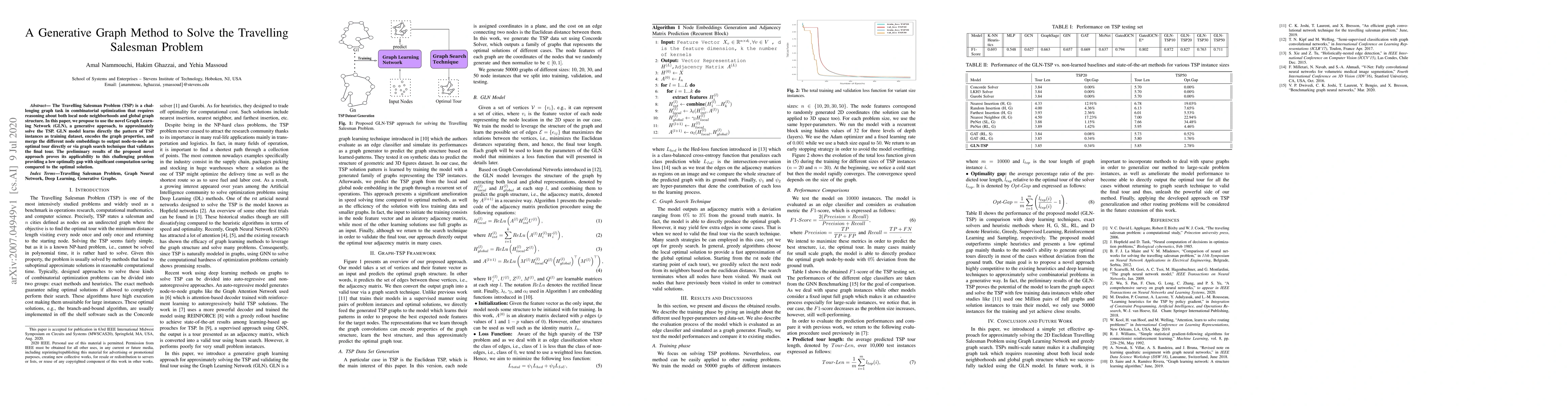 This paper introduces a generative Graph Learning Network (GLN) to solve the Travelling Salesman Problem (TSP) by learning TSP instance patterns and merging node embeddings to generate an optimal tour, demonstrating low optimality gap and significant computational savings.