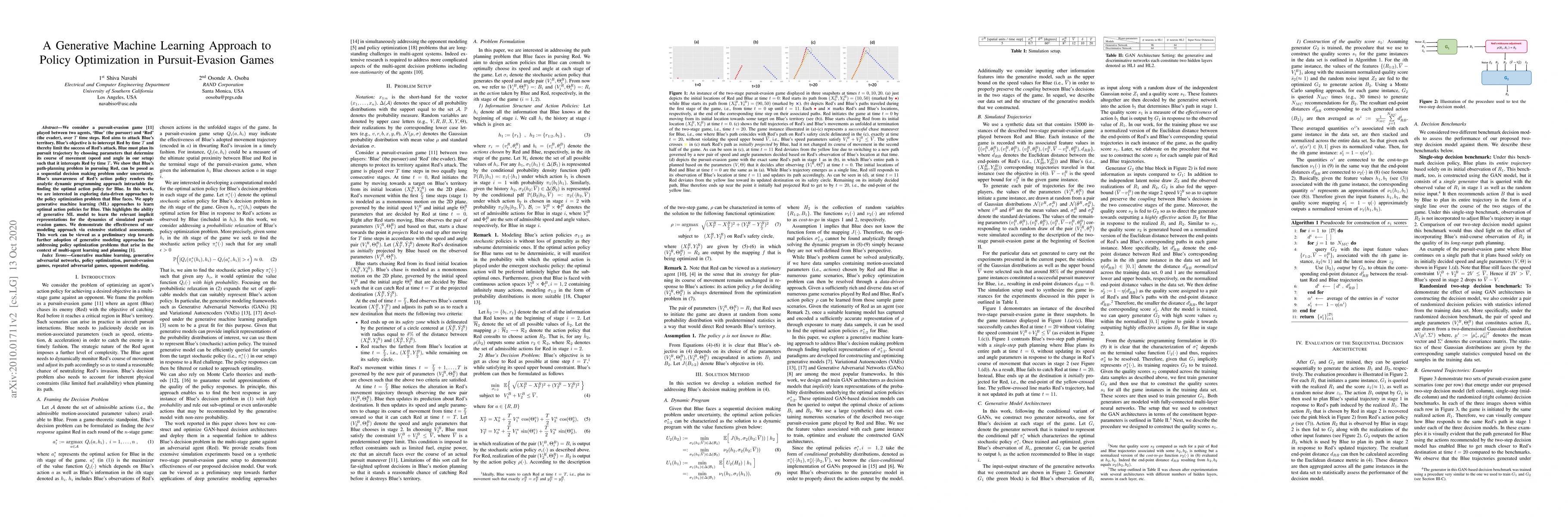We consider a pursuit-evasion game [11] played between two agents, 'Blue' (the pursuer) and 'Red' (the evader), over $T$ time steps. Red aims to attack Blue's territory. Blue's objective is to intercept Red by time $T$ and thereby limit the success of Red's attack. Blue must plan its pursuit trajectory by choosing parameters that determine its course of movement (speed and angle in our setup) such that it intercepts Red by time $T$. We show that Blue's path-planning problem in pursuing Red, can be posed as a sequential decision making problem under uncertainty. Blue's unawareness of Red's action policy renders the analytic dynamic programming approach intractable for finding the optimal action policy for Blue. In this work, we are interested in exploring data-driven approaches to the policy optimization problem that Blue faces. We apply generative machine learning (ML) approaches to learn optimal action policies for Blue. This highlights the ability of generative ML model to learn the relevant implicit representations for the dynamics of simulated pursuit-evasion games. We demonstrate the effectiveness of our modeling approach via extensive statistical assessments. This work can be viewed as a preliminary step towards further adoption of generative modeling approaches for addressing policy optimization problems that arise in the context of multi-agent learning and planning [1].
