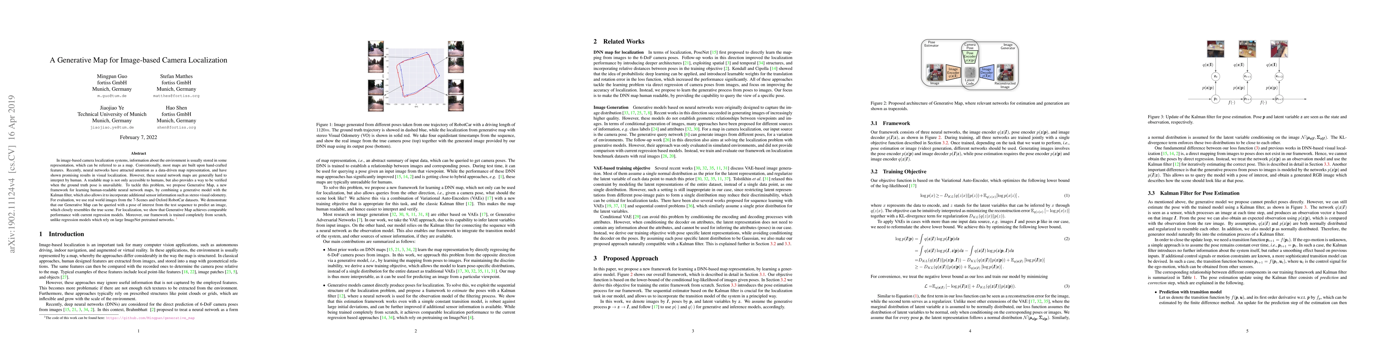This paper proposes Generative Map, a framework combining a generative model with the Kalman filter for learning human-readable neural network maps in image-based camera localization. The approach achieves comparable localization performance to regression models while being trained from scratch and providing interpretable maps.