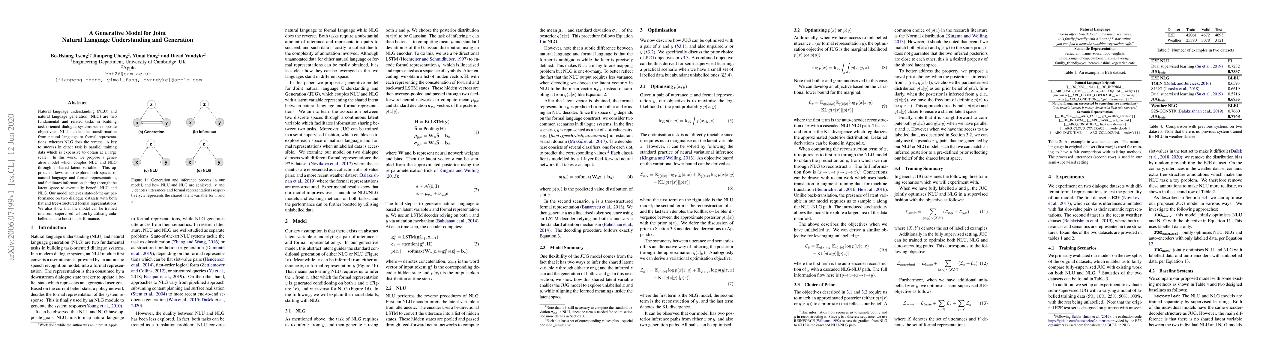 This paper proposes a generative model that jointly trains natural language understanding (NLU) and natural language generation (NLG) using a shared latent variable, achieving state-of-the-art results on dialogue datasets. The model leverages semi-supervised training to enhance performance using unlabelled data.