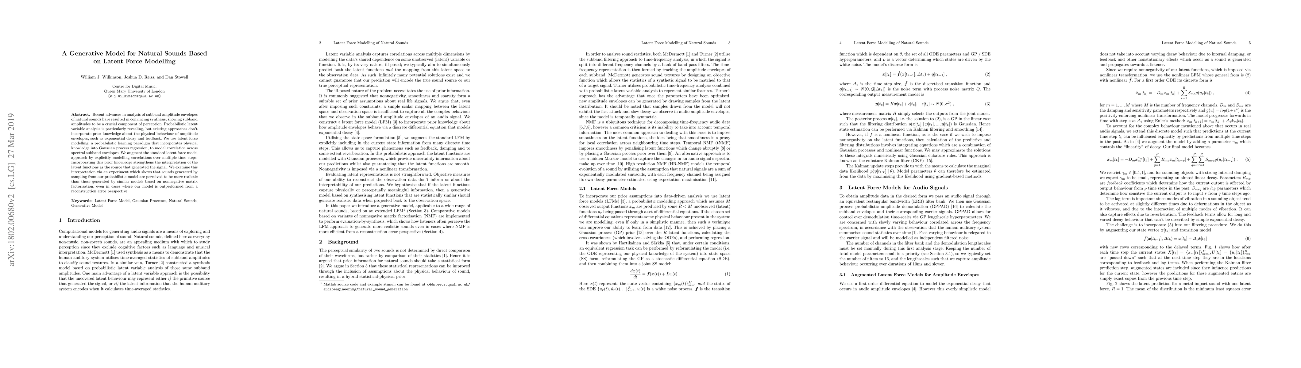 This paper proposes a generative model for natural sounds using latent force modelling that incorporates prior knowledge about the physical behavior of amplitude envelopes. The model generates more realistic sounds compared to those from non-negative matrix factorization, despite potentially lower reconstruction accuracy, by explicitly modeling correlations over multiple time steps.