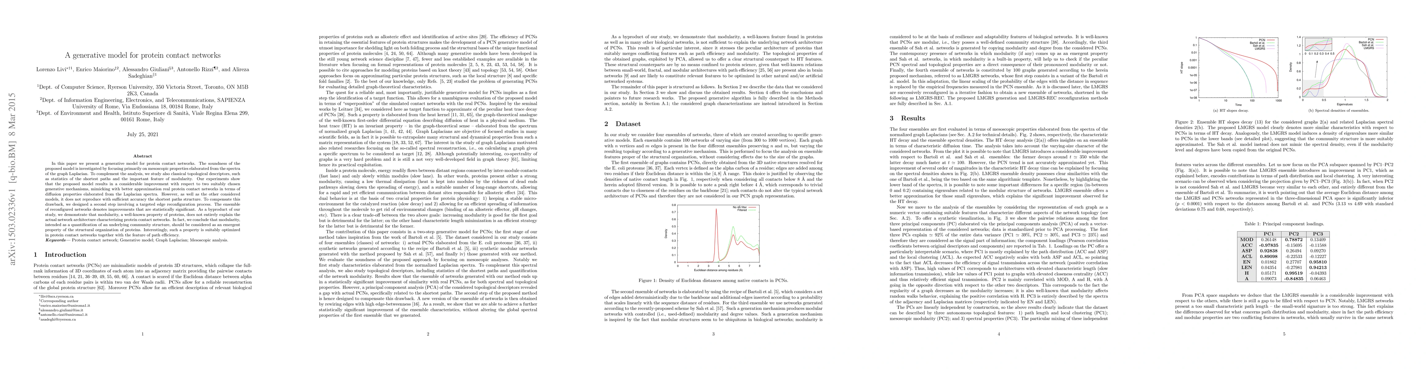 This paper introduces a generative model for protein contact networks, showing improved diffusion properties compared to other models. Despite this, it struggles with shortest path structures, which are addressed through a targeted edge reconfiguration process. The study also finds that modularity, often seen as a key feature, is an emergent property optimized alongside path efficiency in protein networks.