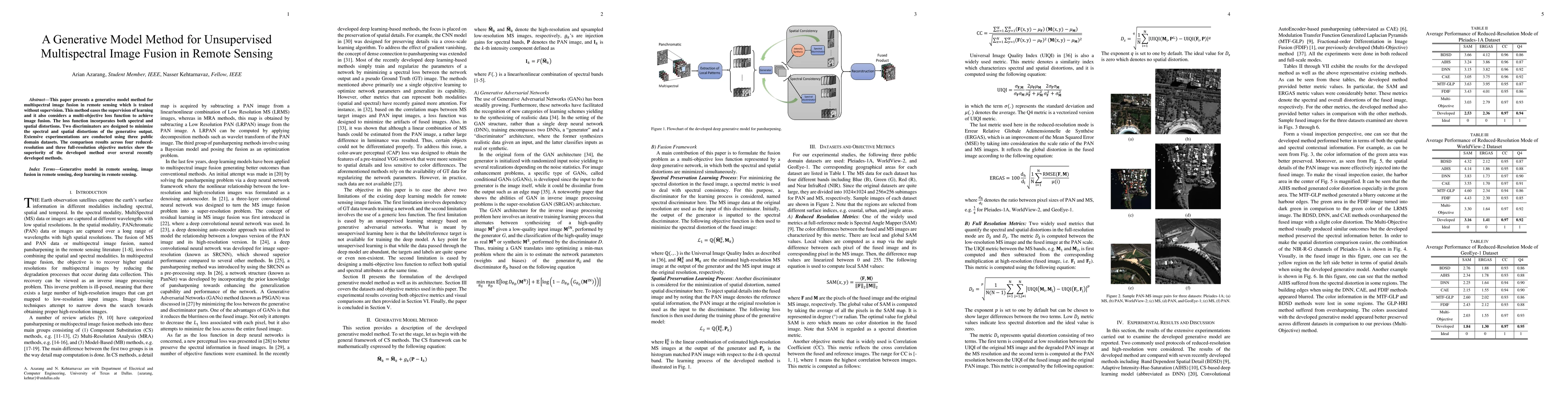 This paper introduces an unsupervised generative model for multispectral image fusion in remote sensing, employing a multi-objective loss function to minimize spectral and spatial distortions. Experiments on three datasets demonstrate its superior performance over other recent methods.