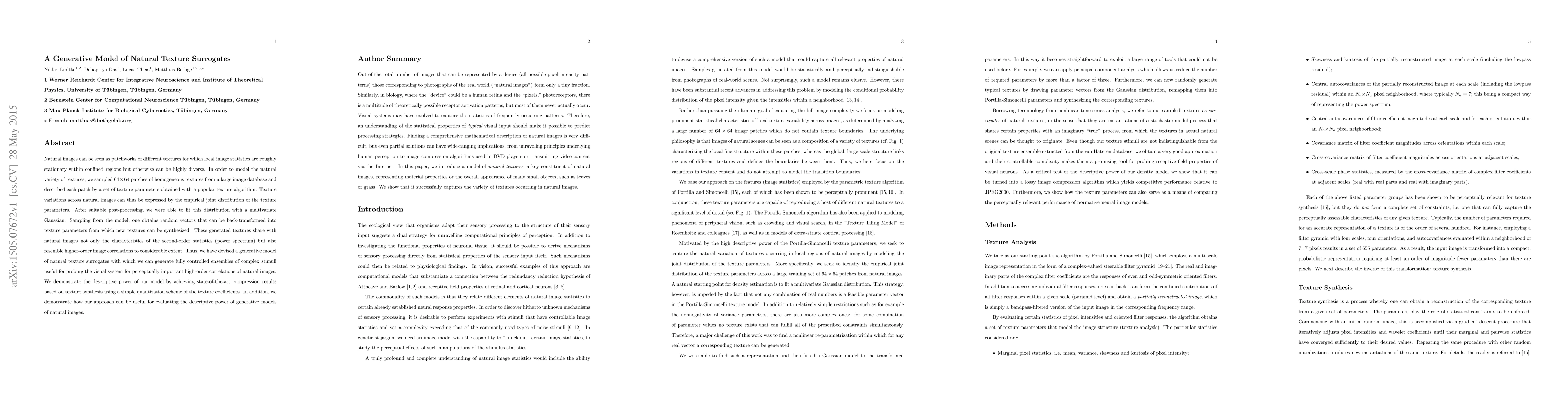 Natural images can be viewed as patchworks of different textures, where the local image statistics is roughly stationary within a small neighborhood but otherwise varies from region to region. In order to model this variability, we first applied the parametric texture algorithm of Portilla and Simoncelli to image patches of 64X64 pixels in a large database of natural images such that each image patch is then described by 655 texture parameters which specify certain statistics, such as variances and covariances of wavelet coefficients or coefficient magnitudes within that patch. To model the statistics of these texture parameters, we then developed suitable nonlinear transformations of the parameters that allowed us to fit their joint statistics with a multivariate Gaussian distribution. We find that the first 200 principal components contain more than 99% of the variance and are sufficient to generate textures that are perceptually extremely close to those generated with all 655 components. We demonstrate the usefulness of the model in several ways: (1) We sample ensembles of texture patches that can be directly compared to samples of patches from the natural image database and can to a high degree reproduce their perceptual appearance. (2) We further developed an image compression algorithm which generates surprisingly accurate images at bit rates as low as 0.14 bits/pixel. Finally, (3) We demonstrate how our approach can be used for an efficient and objective evaluation of samples generated with probabilistic models of natural images.