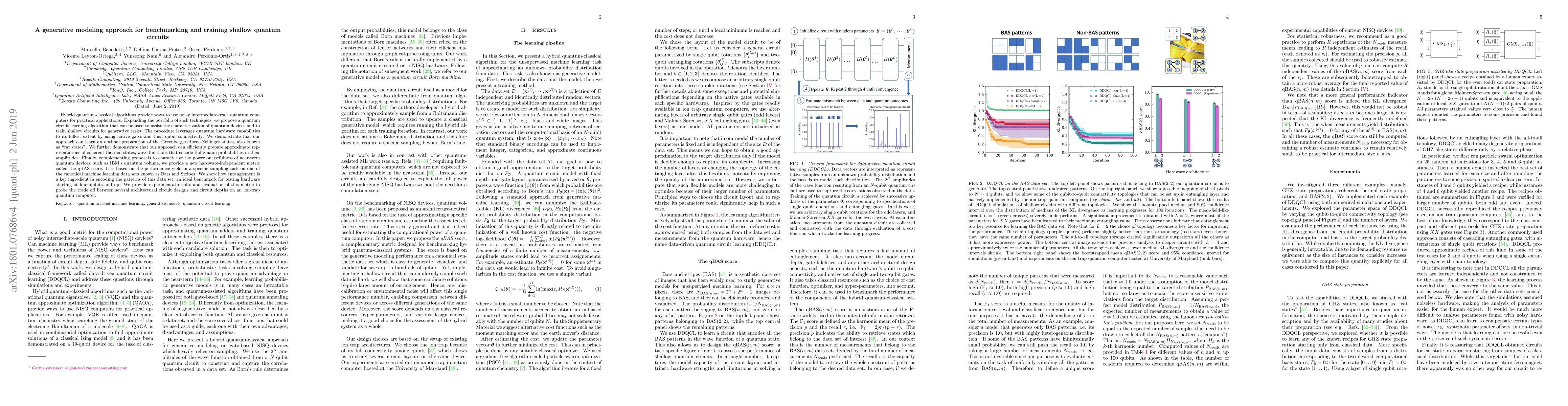 Hybrid quantum-classical algorithms provide ways to use noisy intermediate-scale quantum computers for practical applications. Expanding the portfolio of such techniques, we propose a quantum circuit learning algorithm that can be used to assist the characterization of quantum devices and to train shallow circuits for generative tasks. The procedure leverages quantum hardware capabilities to its fullest extent by using native gates and their qubit connectivity. We demonstrate that our approach can learn an optimal preparation of the Greenberger-Horne-Zeilinger states, also known as "cat states". We further demonstrate that our approach can efficiently prepare approximate representations of coherent thermal states, wave functions that encode Boltzmann probabilities in their amplitudes. Finally, complementing proposals to characterize the power or usefulness of near-term quantum devices, such as IBM's quantum volume, we provide a new hardware-independent metric called the qBAS score. It is based on the performance yield in a specific sampling task on one of the canonical machine learning data sets known as Bars and Stripes. We show how entanglement is a key ingredient in encoding the patterns of this data set; an ideal benchmark for testing hardware starting at four qubits and up. We provide experimental results and evaluation of this metric to probe the trade off between several architectural circuit designs and circuit depths on an ion-trap quantum computer.