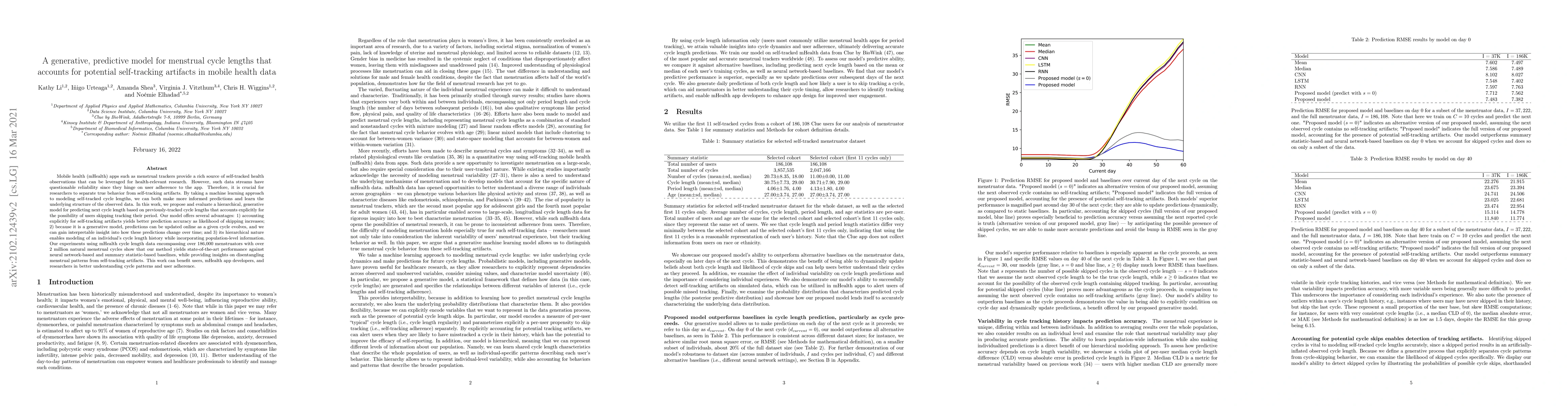 This paper proposes a hierarchical, generative model for predicting menstrual cycle lengths that accounts for self-tracking artifacts in mobile health data. The model improves prediction accuracy by explicitly modeling the likelihood of users skipping tracking, offers online updates, and provides insights into how predictions evolve over time.